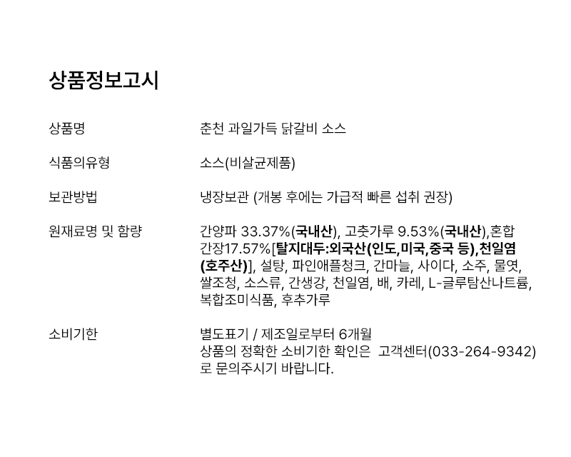- Á¦Ç°¸í,½ÄǰÀÇ À¯Çü,»ý»êÀÚ ¹× ¼ÒÀçÁö,Á¦Á¶¿¬¿ùÀÏ,¼Òºñ±âÇÑ,¿ë·®(Áß·®),¼ö·®,¿øÀç·á¸í ¹× ÇÔ·®,¼ÒºñÀÚ¾ÈÀüÀ» À§ÇÑ ÁÖÀÇ»çÇ×,¼ÒºñÀÚ»ó´ã °ü·Ã ÀüȹøÈ£,¿µ¾ç¼ººÐ µîÀº »óǰ »ó¼¼Á¤º¸¿¡ Ç¥½Ã µÇ¾î ÀÖ½À´Ï´Ù.