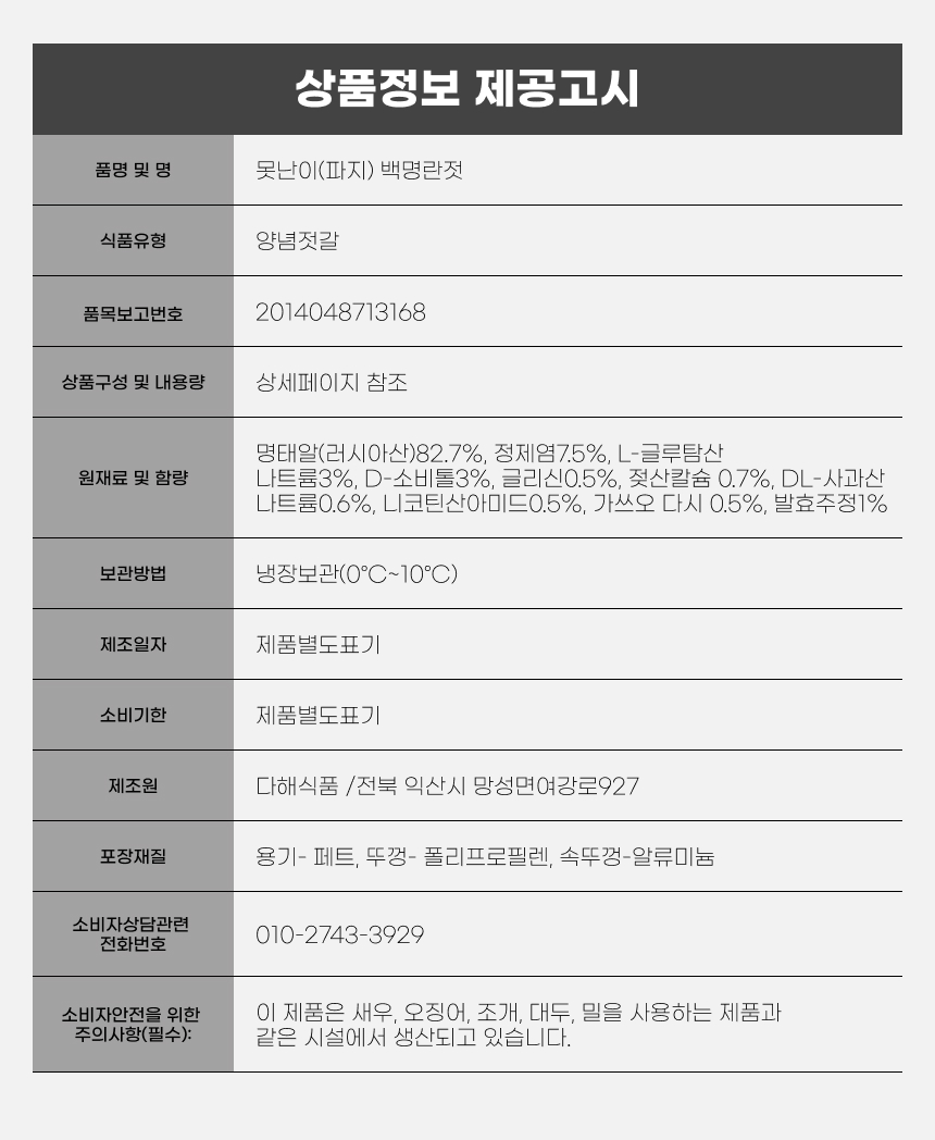 - ǰ¸ñ ¶Ç´Â ¸íĪ,¿ë·®(Áß·®),¼ö·®,Å©±â,»ý»êÀÚ,°ü·Ã¹ý»ó Ç¥½Ã»çÇ×,»óǰ±¸¼º,º¸°ü¹æ¹ý,¼ÒºñÀÚ¾ÈÀüÀ» À§ÇÑ ÁÖÀÇ»çÇ×,¼ÒºñÀÚ»ó´ã °ü·Ã ÀüȹøÈ£,ģȯ°æÀÎÁõ µîÀº »óǰ »ó¼¼Á¤º¸¿¡ Ç¥½Ã µÇ¾î ÀÖ½À´Ï´Ù.
