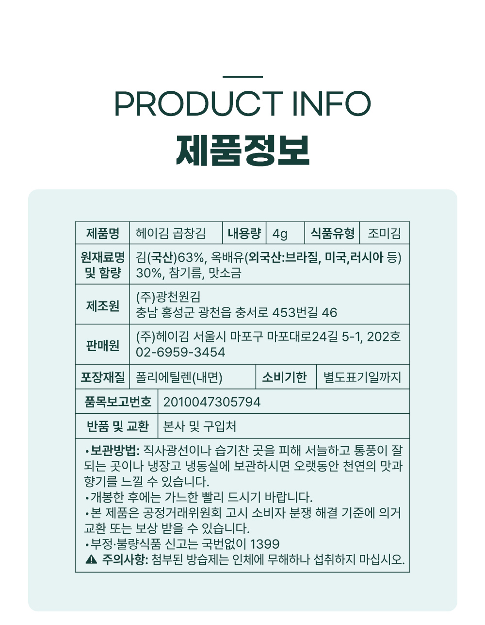 - Á¦Ç°¸í,½ÄǰÀÇ À¯Çü,»ý»êÀÚ ¹× ¼ÒÀçÁö,¿ë·®(Áß·®),¼ö·®,¿øÀç·á¸í ¹× ÇÔ·®,¼ÒºñÀÚ¾ÈÀüÀ» À§ÇÑ ÁÖÀÇ»çÇ×,¼ÒºñÀÚ»ó´ã °ü·Ã ÀüȹøÈ£,¿µ¾ç¼ººÐ µîÀº »óǰ »ó¼¼Á¤º¸¿¡ Ç¥½Ã µÇ¾î ÀÖ½À´Ï´Ù.