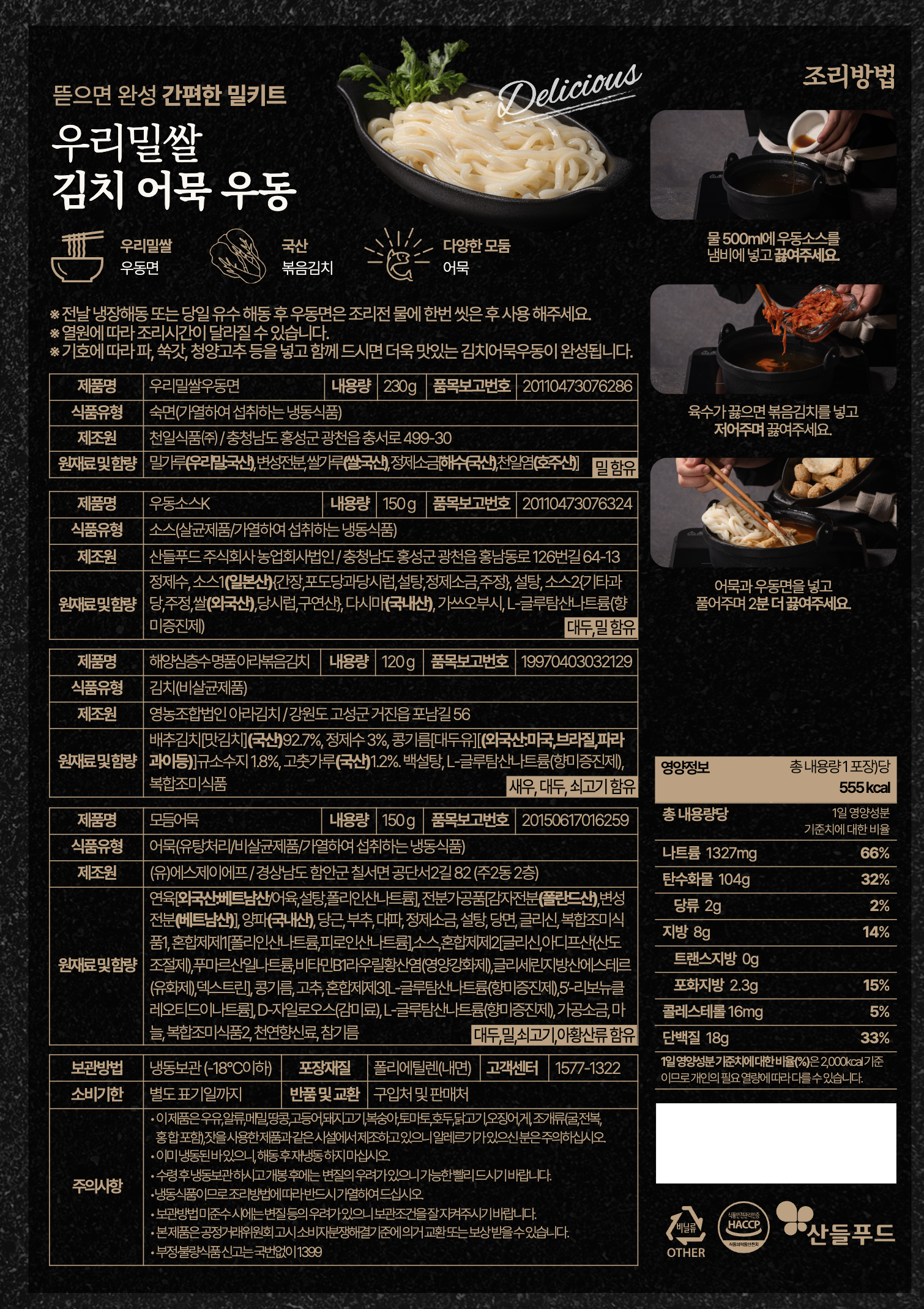 | ¿ë·®(Áß·®),¼ö·® | ¿ìµ¿¸é 230g ¿ìµ¿¼Ò½º 150g ººÀ½±èÄ¡ 120g ¸ðµë¾î¹¬ 150g (1ºÀ ±âÁØ) |