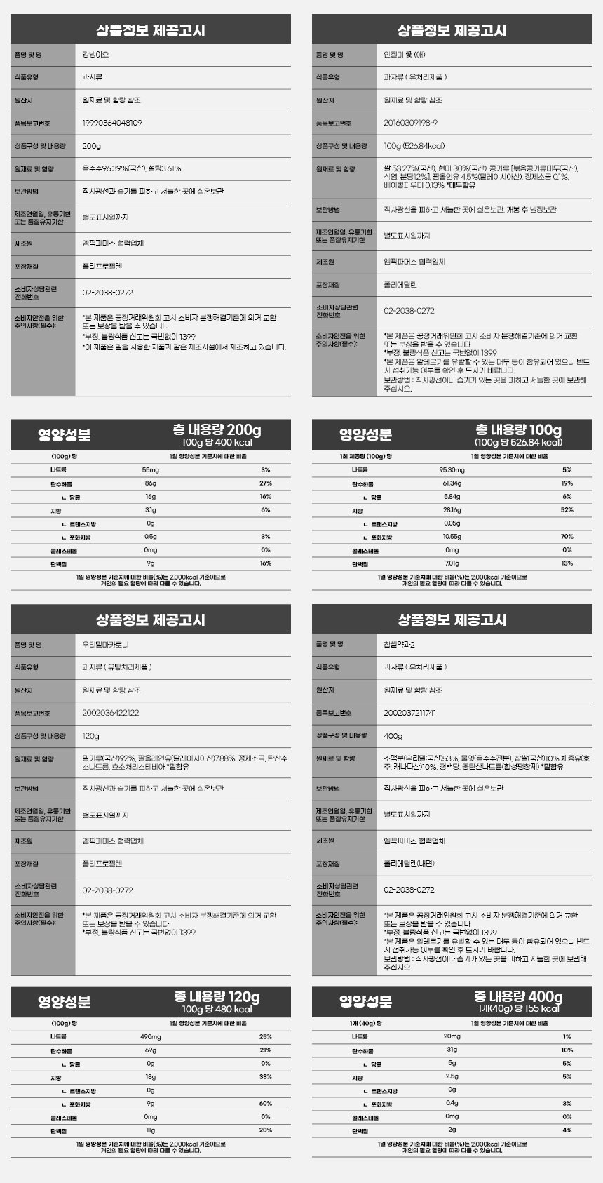 - Á¦Ç°¸í,½ÄǰÀÇ À¯Çü,»ý»êÀÚ ¹× ¼ÒÀçÁö,¿ë·®(Áß·®),¼ö·®,¿øÀç·á¸í ¹× ÇÔ·®,¼ÒºñÀÚ¾ÈÀüÀ» À§ÇÑ ÁÖÀÇ»çÇ×,¼ÒºñÀÚ»ó´ã °ü·Ã ÀüȹøÈ£,¿µ¾ç¼ººÐ,À¯ÀüÀÚº¯Çü½Äǰ,¼öÀÔ½Äǰ µîÀº »óǰ »ó¼¼Á¤º¸¿¡ Ç¥½Ã µÇ¾î ÀÖ½À´Ï´Ù.