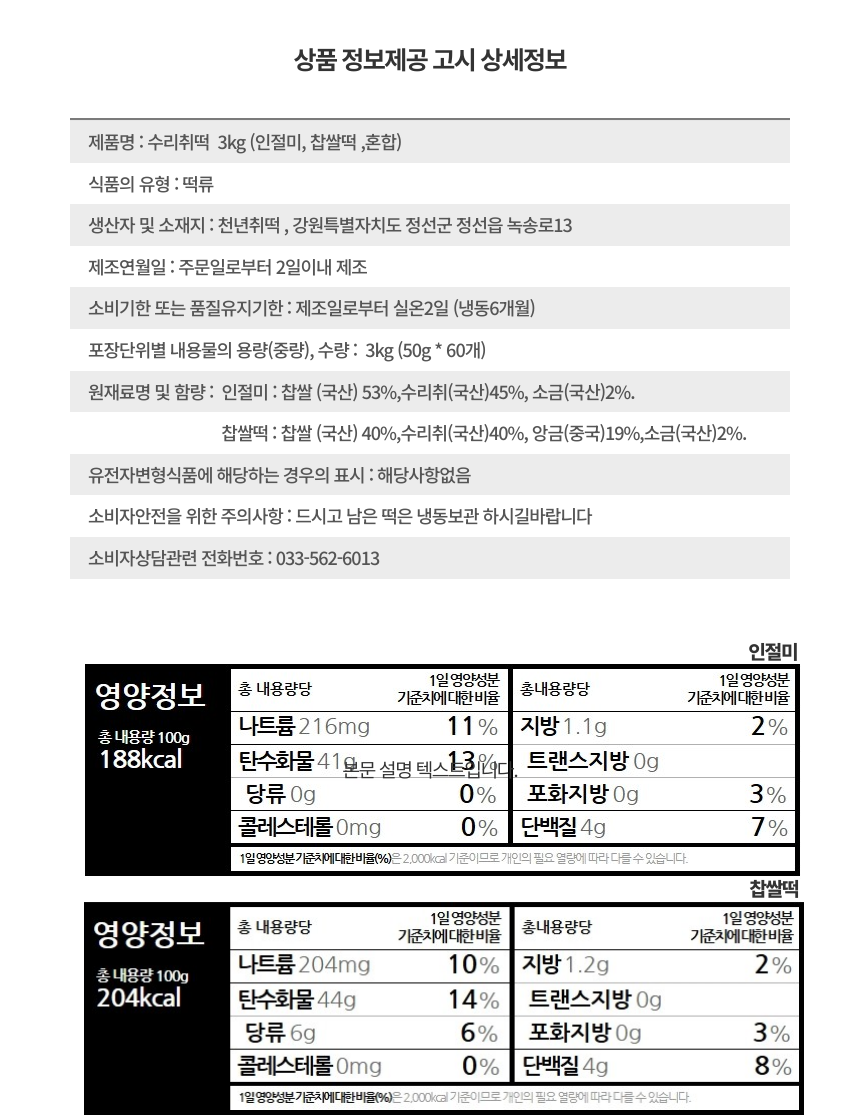 - Á¦Ç°¸í,½ÄǰÀÇ À¯Çü,»ý»êÀÚ ¹× ¼ÒÀçÁö,Á¦Á¶¿¬¿ùÀÏ,¼Òºñ±âÇÑ,¿ë·®(Áß·®),¼ö·®,¿øÀç·á¸í ¹× ÇÔ·®,¼ÒºñÀÚ¾ÈÀüÀ» À§ÇÑ ÁÖÀÇ»çÇ×,¼ÒºñÀÚ»ó´ã °ü·Ã ÀüÈ­¹øÈ£,¿µ¾ç¼ººÐ,À¯ÀüÀÚº¯Çü½Äǰ,¼öÀÔ½Äǰ µîÀº »óǰ »ó¼¼Á¤º¸¿¡ Ç¥½Ã µÇ¾î ÀÖ½À´Ï´Ù.