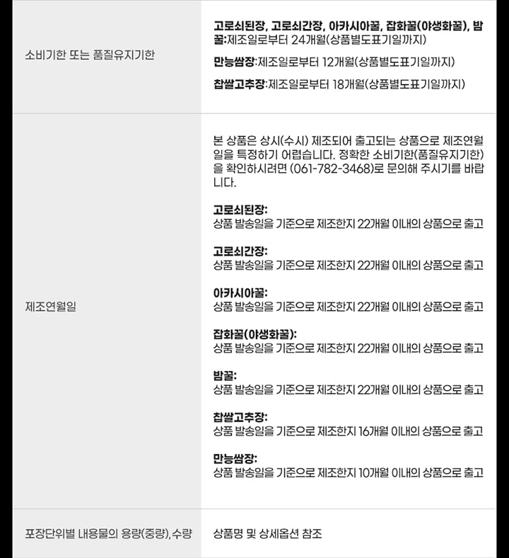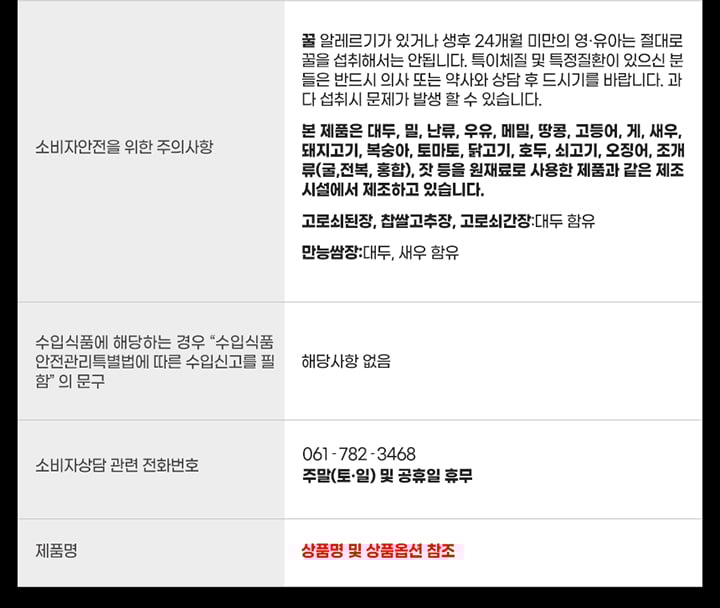 - Á¦Ç°¸í,½ÄǰÀÇ À¯Çü,»ý»êÀÚ ¹× ¼ÒÀçÁö,Á¦Á¶¿¬¿ùÀÏ,¼Òºñ±âÇÑ,¿øÀç·á¸í ¹× ÇÔ·®,¼ÒºñÀÚ¾ÈÀüÀ» À§ÇÑ ÁÖÀÇ»çÇ×,¼ÒºñÀÚ»ó´ã °ü·Ã ÀüȹøÈ£,¿µ¾ç¼ººÐ µîÀº »óǰ »ó¼¼Á¤º¸¿¡ Ç¥½Ã µÇ¾î ÀÖ½À´Ï´Ù.