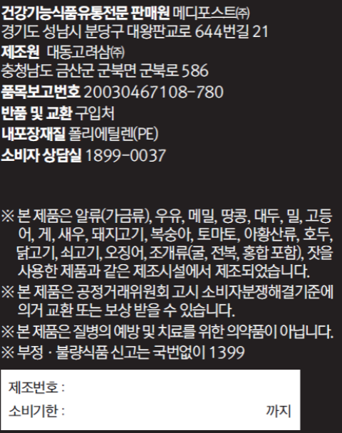 - Á¦Ç°¸í,½ÄǰÀÇ À¯Çü,Á¦Á¶¾÷¼ÒÀÇ ¸íΰú ¼ÒÀçÁö,Á¦Á¶¿¬¿ùÀÏ,¿ë·®(Áß·®),¼ö·®,¿øÀç·á¸í ¹× ÇÔ·®,¿µ¾çÁ¤º¸,±â´ÉÁ¤º¸,¼·Ãë·®,¼·Ãë¹æ¹ý,ÁÖÀÇ»çÇ×,ºÎÀÛ¿ë,°Ç°±â´É½Äǰ,¼ÒºñÀÚ¾ÈÀüÀ» À§ÇÑ ÁÖÀÇ»çÇ×,¼ÒºñÀÚ»ó´ã °ü·Ã ÀüȹøÈ£,À¯ÀüÀÚº¯Çü°Ç°±â´É½Äǰ,¼öÀÔ½Äǰ µîÀº »óǰ »ó¼¼Á¤º¸¿¡ Ç¥½Ã µÇ¾î ÀÖ½À´Ï´Ù.