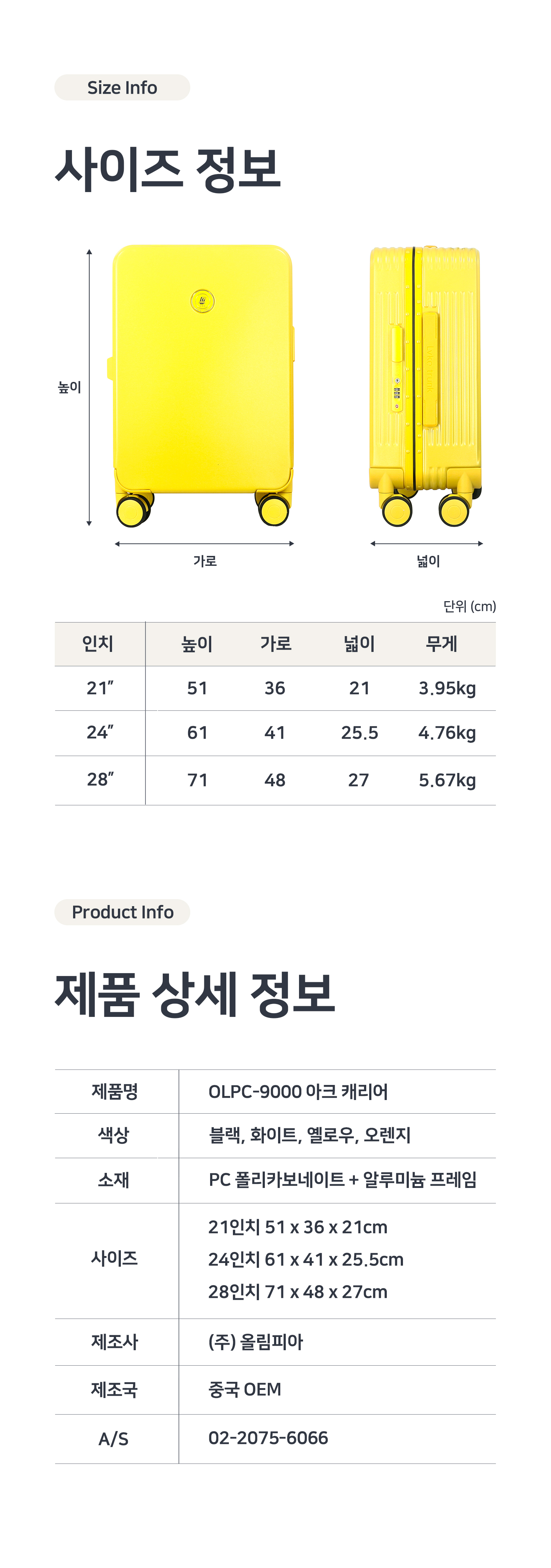 | Å©±â | 21ÀÎÄ¡ 51x36x21cm 3.95kg 24ÀÎÄ¡ 61x41x25.5cm 4.76kg 28ÀÎÄ¡ 71x48x27cm 5.67kg |