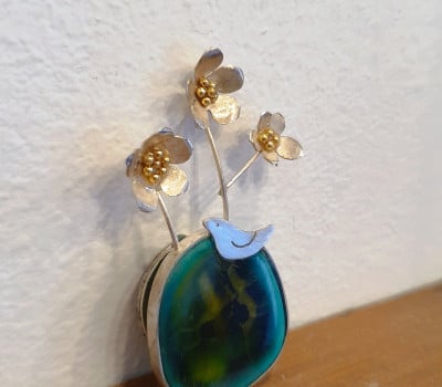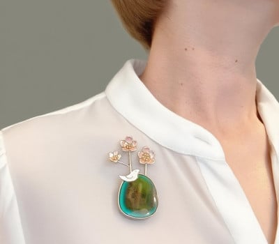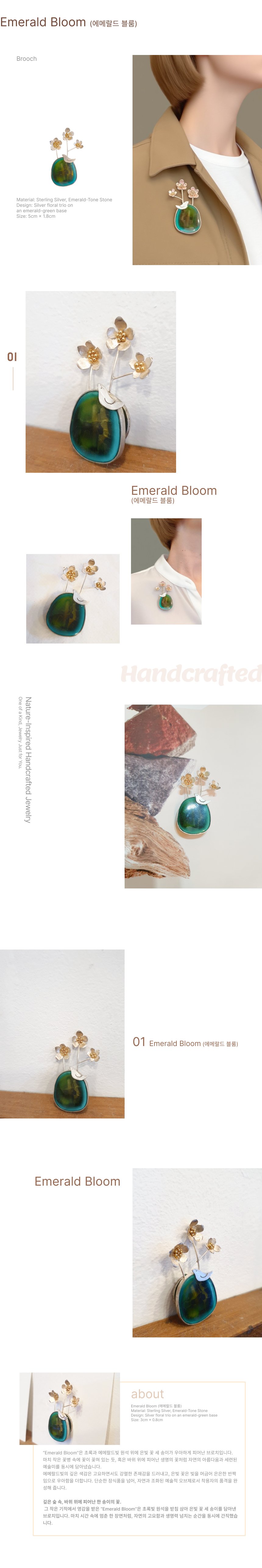 Emerald Bloom (¿¡¸Þ¶öµå ºí·ë) Material: Sterling Silver, Emerald-Tone Stone?Design: Silver floral trio on an emerald-green base?Size: 3cm ¡¿ 0.8cm ¡°Emerald Bloom¡±Àº Ãʷϰú ¿¡¸Þ¶öµåºû ¿ø¼® À§¿¡ Àººû ²É ¼¼ ¼ÛÀ̰¡ ¿ì¾ÆÇÏ°Ô ÇǾ ºê·ÎÄ¡ÀÔ´Ï´Ù. ¸¶Ä¡ ÀÛÀº ²Éº´ ¼Ó¿¡ ²ÉÀÌ ²ÈÇô ÀÖ´Â µí, ȤÀº ¹ÙÀ§ À§¿¡ ÇǾ »ý¸íÀÇ ²Éó·³ ÀÚ¿¬ÀÇ ¾Æ¸§´Ù¿ò°ú ¼¼·ÃµÈ ¿¹¼ú¹Ì¸¦ µ¿½Ã¿¡ ´ã¾Æ³Â½À´Ï´Ù. ¿¡¸Þ¶öµåºûÀÇ ±íÀº »ö°¨Àº °í¿äÇϸ鼭µµ °­·ÄÇÑ Á¸Àç°¨À» µå·¯³»°í, Àººû ²ÉÀº ºûÀ» ¸Ó±Ý¾î ÀºÀºÇÑ ¹Ý¦ÀÓÀ¸·Î ¿ì¾ÆÇÔÀ» ´õÇÕ´Ï´Ù. ´Ü¼øÇÑ Àå½ÄǰÀ» ³Ñ¾î, ÀÚ¿¬°ú Á¶È­µÈ ¿¹¼úÀû ¿ÀºêÁ¦·Î¼­ Âø¿ëÀÚÀÇ Ç°°ÝÀ» ¿Ï¼ºÇØ ÁÝ´Ï´Ù.??±íÀº ½£ ¼Ó, ¹ÙÀ§ À§¿¡ ÇǾ ÇÑ ¼ÛÀÌÀÇ ²É.? ±× ÀÛÀº ±âÀû¿¡¼­ ¿µ°¨À» ¹ÞÀº ¡°Emerald Bloom¡±Àº ÃʷϺû ¿ø¼®À» ¹Þħ »ï¾Æ Àººû ²É ¼¼ ¼ÛÀ̸¦ ´ã¾Æ³½ ºê·ÎÄ¡ÀÔ´Ï´Ù. ¸¶Ä¡ ½Ã°£ ¼Ó¿¡ ¸ØÃá ÇÑ Àå¸éó·³, ÀÚ¿¬ÀÇ °í¿äÇÔ°ú »ý¸í·Â ³ÑÄ¡´Â ¼ø°£À» µ¿½Ã¿¡ °£Á÷Çß½À´Ï´Ù.