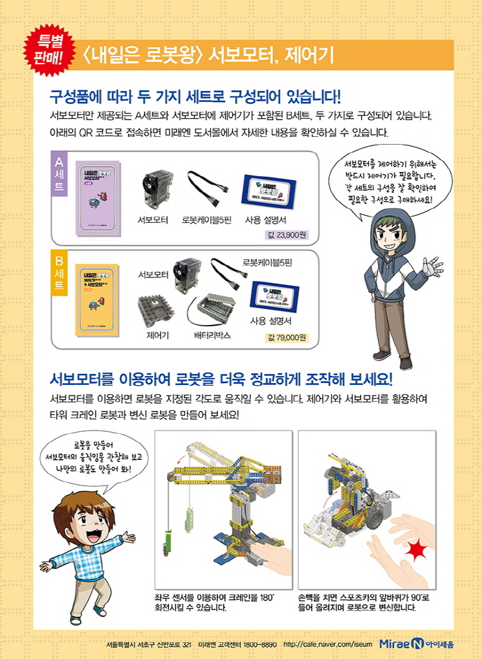 ¼º¸¸ðÅÍ´Â ·Îº¿ÀÇ °üÀýÀ» ¿òÁ÷ÀÌ´Â µî Á¶°Ç¿¡ µû¶ó ƯÁ¤ÇÑ °¢µµ¸¦ À¯ÁöÇØ¾ß ÇÏ´Â °÷¿¡ ÁÖ·Î »ç¿ëÇÕ´Ï´Ù. Á¦¾î±â¿¡ ¼º¸¸ðÅ͸¦ ¿¬°áÇÏ¿© ÄÚµùÇÏ¸é ·Îº¿ÀÌ ¿òÁ÷ÀÌ´Â °¢µµ¸¦ ÁöÁ¤ÇÏ¿© ´õ¿í Á¤±³ÇÏ°Ô Á¦¾îÇÒ ¼ö ÀÖ½À´Ï´Ù. <³»ÀÏÀº ·Îº¿¿Õ> 1~8±Ç ·Îº¿ ŰƮ¸¦ °áÇÕÇϸé Á¿ì·Î 180µµ ȸÀüÇϴ Ÿ¿ö Å©·¹ÀÎ ·Îº¿°ú ¼Õ»ÁÀ» Ä¡¸é º¯½ÅÇÏ´Â ½ºÆ÷Ã÷Ä« ·Îº¿ µî »õ·Î¿î ·Îº¿À» ¸¸µé ¼ö ÀÖ½À´Ï´Ù. ¾ÆÀ̼¼¿ò Ä«Æä¿¡¼ ŰƮ °¡À̵å¿Í ÇÁ·Î±×·¥À» ´Ù¿î¹Þ¾Æ ¼º¸¸ðÅÍÀÇ ¿òÁ÷ÀÓÀ» °üÂûÇØ º¸°í, ³ª¸¸ÀÇ ·Îº¿À» ¸¸µé¾î ¿øÇÏ´Â ´ë·Î ÄÚµùÇØ º¸¼¼¿ä! ³»ÀÏÀº ·Îº¿¿Õ ¼º¸¸ðÅÍ ¼¼Æ®´Â ¼º¸¸ðÅÍ(SM-10), ·Îº¿ÄÉÀ̺í5ÇÉ, »ç¿ë¼³¸í¼·Î ÀÌ·ç¾îÁø A¼¼Æ®¿Í ¼º¸¸ðÅÍ(SM-10), ·Îº¿ÄÉÀ̺í5ÇÉ, Á¦¾î±â(CM-150), ¹èÅ͸®¹Ú½º(ABB-030), »ç¿ë¼³¸í¼·Î ÀÌ·ç¾îÁø B¼¼Æ®·Î ±¸¼ºµÇ¾î ÀÖ½À´Ï´Ù. ¼º¸¸ðÅ͸¦ Á¦¾îÇϱâ À§Çؼ´Â Á¦¾î±â°¡ ¹Ýµå½Ã ÇÊ¿äÇϹǷΠ°¢ ¼¼Æ®ÀÇ ±¸¼ºÀ» Àß È®ÀÎÇÏ¿© ÇÊ¿äÇÑ ±¸¼ºÀ¸·Î ±¸¸ÅÇϼ¼¿ä.