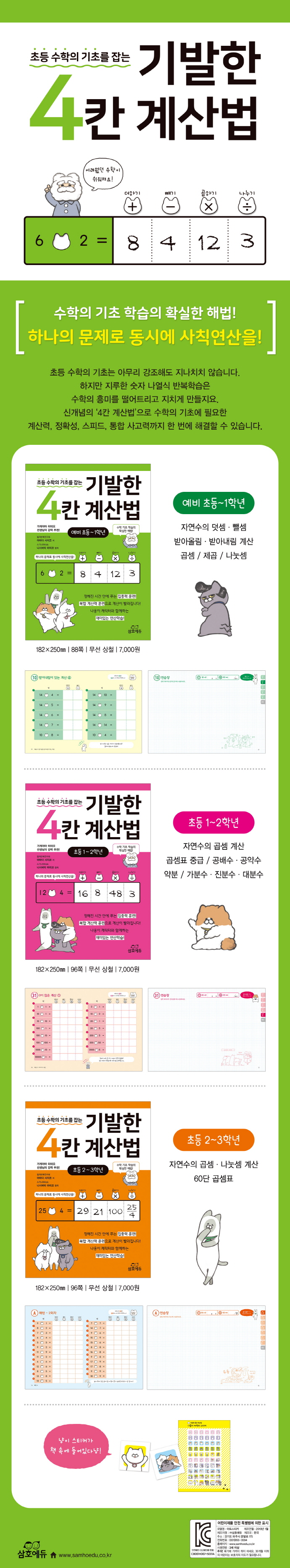ÃÊµî ¼öÇÐÀÇ ±âÃÊ´Â ¾Æ¹«¸® °Á¶Çصµ Áö³ªÄ¡Áö ¾Ê½À´Ï´Ù. ÇÏÁö¸¸ Áö·çÇÑ ¼ýÀÚ ³ª¿½Ä ¹Ýº¹ÇнÀÀº ¼öÇÐÀÇ Èï¹Ì¸¦ ¶³¾îÆ®¸®°í ÁöÄ¡°Ô ¸¸µéÁö¿ä. ½Å°³³ä ¡®4Ä °è»ê¹ý¡¯À¸·Î ¼öÇÐÀÇ ±âÃÊ¿¡ ÇÊ¿äÇÑ °è»ê·Â, Á¤È®¼º, ÅëÇÕ »ç°í·Â±îÁö ÇÑ ¹ø¿¡ ÇØ°áÇÒ ¼ö ÀÖ½À´Ï´Ù!