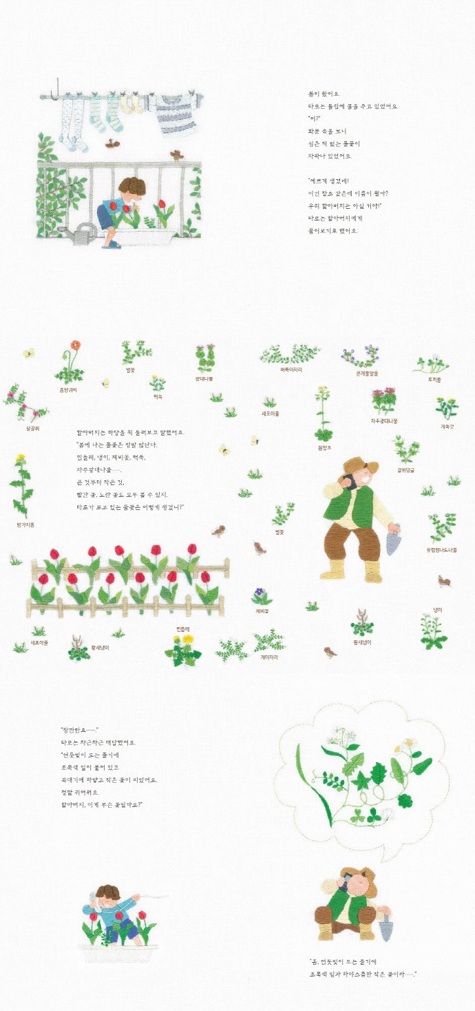 ÀÌ ÀÛǰÀº ÇҾƹöÁö¿Í ¾ÆÀÌÀÇ ÁÖ°í¹Þ´Â ´ëȰ¡ µ¸º¸ÀÌ´Â ±×¸²Ã¥ÀÔ´Ï´Ù. ¿ÀÁ÷ ¾ð¾î·Î¸¸ ¹¯°í, ´ë´äÇϰí, ¹¦»çÇÏÁö¿ä. Àüȸ¦ ¸Å°³·Î ¹®´äÀ» ÅëÇØ À̾îÁö´Â À̾߱â´Â ¸¶Ä¡ ¾îµð·Î Æ¥Áö ¸ð¸£´Â °øÃ³·³ ÅëÅë Æ¢¸ç Èï¹Ì·Ó°Ô »ó»ó·ÂÀ» ÀÚ±ØÇÕ´Ï´Ù. ¾ð¾î¸¦ ÅëÇØ À̹ÌÁö¸¦ ±×·Á ³»´Â ÀÏ¿¡´Â ¼¼½ÉÇÑ °üÂû°ú Àγ»°¡ ÇÊ¿äÇÕ´Ï´Ù. Ÿ·Î´Â ¾ÆÀÌÀÇ ´«À¸·Î È£±â½ÉÀ» °¡µæ ¾È°í ÀÛÀº ²ÉÀ» À̸®Àú¸® »ìÇÇ¸ç ±× ¸ð½ÀÀ» ¹¦»çÇϱ⠽ÃÀÛÇÕ´Ï´Ù. ¿¬µÔºû ÁٱⰡ ¼ ÀÖ´Â ¸ð¾ç, Áٱ⿡ ´Þ¸° ÀÙÀÇ Ã˰¨, Á¶±×¸Ä°Ô ÇÉ ²ÉÀÇ »ö±ò¡¦¡¦. ¿©±â¼ ÁÖ¸ñÇÒ °ÍÀº ´ÙÁ¤ÇÏ°Ô ¾ÆÀÌÀÇ ¸»¿¡ ±Í¸¦ ±â¿ï¿© ÁÖ°í Àý´ë Á¶±ÞÇÏ°Ô ¹¯Áö ¾Ê´Â ÇҾƹöÁöÀÇ µû¶æÇÑ ¹è·ÁÀÔ´Ï´Ù. ÇҾƹöÁö´Â ÇѵΠ¹øÀÇ ¹®´äÀ¸·Î À̸§À» ¾Ë¾Æ³»Áö ¸øÇÏÀÚ ½Ç¸ÁÇϴ Ÿ·Î¿¡°Ô ÀÚ¿¬½º·´°Ô Áú¹®À» À̾´Ï´Ù. ÁٱⰡ ¶¥ À§¿¡ ´©¿ö ÀÖ´ÂÁö Âß »¸¾î ÀÖ´ÂÁö, ÀÙÀÌ µ¿±×¶õÁö ¼Õ¹Ù´Ú ¸ð¾çÀÎÁö, ±× ÀÙ¿¡ ÅÐÀÌ ÀÖ´ÂÁö ¾ø´ÂÁö¡¦¡¦. ¾î¶² »ç¹°À» ÀÔüÀûÀ¸·Î °üÂûÇÏ´Â ÀÏ¿¡´Â ¼¼½ÉÇÑ °üÂû°ú Àγ»°¡ ÇÊ¿äÇÔÀ» ¾ÆÀ̰¡ ½º½º·Î ´À³¢°Ô ÇÏ´Â °ÍÀÌÁö¿ä. ´öºÐ¿¡ Ÿ·Î´Â ³¡±îÁö Æ÷±âÇÏÁö ¾Ê°í ÀÛÀº Ç®²ÉÀÇ À̸§À» ºÎ¸¦ ¼ö ÀÖ¾ú´ä´Ï´Ù. ÁÖ°í¹Þ´Â ´ëÈ ¼Ó¿¡ ±êµç ÇҾƹöÁö¿Í Ÿ·ÎÀÇ ±³°¨ÀÌ ¼¼´ë¸¦ ¶Ù¾î³Ñ´Â µû¶æÇÔÀ» ¾È°Ü ÁÖ´Â ÀÛǰÀÔ´Ï´Ù.