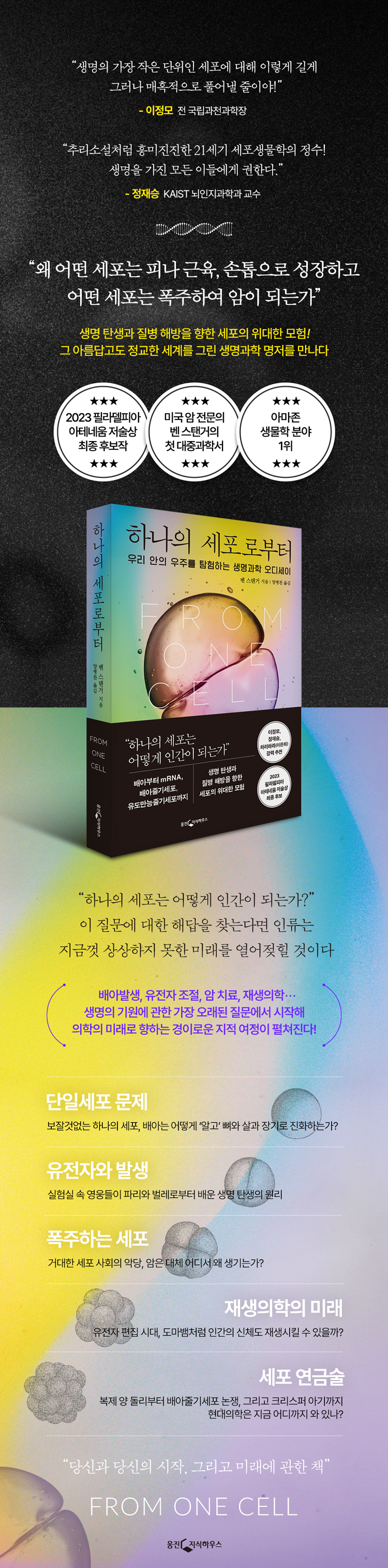 ¹Ì±¹ÀÇ Àú¸íÇÑ ¾Ï ¿¬±¸ÀÚÀÌÀÚ ¼¼Æ÷ ¹× ¹ß»ý»ý¹°ÇÐÀÚÀÎ º¥ ½ºÅİÅ(Ben Stanger)ÀÇ Ã¹ ´ëÁß¼ ¡ºÇϳªÀÇ ¼¼Æ÷·ÎºÎÅÍ(From One Cell)¡»´Â ¹è¾Æ¼¼Æ÷¿Í ¹è¾ÆÁٱ⼼Æ÷¿¡ °üÇÑ °úÇÐÀû ޱ¸ÀÇ ¿©Á¤»Ó ¾Æ´Ï¶ó, Áúº´ ÇØ¹æ°ú Àç»ýÀ» ÇâÇÑ Çö´ë ÀÇÇÐÀÇ À§´ëÇÑ ¸ðÇèÀ» ´ã°í ÀÖ´Ù. ÀúÀÚ´Â ÀÌ Ã¥¿¡¼ ¹è¾Æ¹ß»ýºÎÅÍ À¯ÀüÀÚ, Áٱ⼼Æ÷, mRNA µî »ý¸íÀÇ ±â¿øÀ» ÃßÀûÇØ ³ª¼± ½ÇÇè½Ç ¼Ó ¿µ¿õµéÀÇ Àå´ëÇÑ ¹ß°ßÀÇ ¿ª»ç·Î ¿ì¸®¸¦ À̲ø¸ç, ³ª¾Æ°¡ À¯ÀüÀÚ ÆíÁý°ú ¼¼Æ÷ ¿ªºÐÈ, Àç»ýÀÇÇÐ µî Áö±Ý ¿ì¸®°¡ ¾Ë¾Æ¾ß ÇÒ Çö´ë ÀÇÇÐÀÇ Ã·¿¹ÇÑ À̽´¸¦ Ã߸®¼Ò¼³Ã³·³ Á¤±³ÇÏ°íµµ Èï¹ÌÁøÁøÇÏ°Ô ÆîÃij½´Ù.