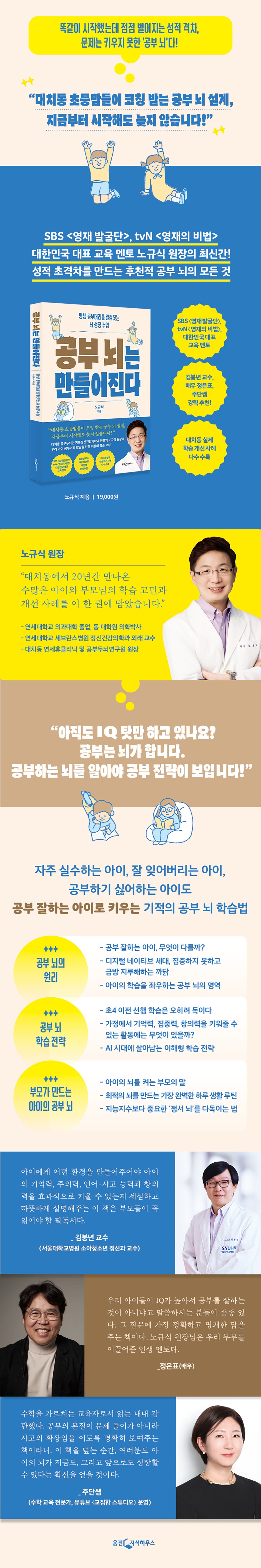 ±×·¯³ª »ç½Ç ÁøÂ¥ ¹®Á¦´Â ¾ÆÀÌÀÇ Áö´ÉÀ̳ª ÁýÁß·ÂÀÌ ¾Æ´Ï¶ó ÇнÀ¿¡ ÇÊ¿äÇÑ ´É·ÂÀ» ²¨³» ¾µ ¼ö ÀÖ´Â ³úÀÇ Á¶°Ç°ú »ýȰȯ°æ, ¸¶À½°¡ÁüÀÌ Á¦´ë·Î ¸ÂÃçÁ® ÀÖÁö ¾ÊÀº °ÍÀ̱⠶§¹®ÀÏ ¼ö ÀÖ´Ù. ÀúÀÚ ³ë±Ô½ÄÀº ¿À·£ ½Ã°£ ³ú°úÇаú ÀÎÁö ¹ß´Þ, ¾Æµ¿½É¸®¸¦ ¿¬±¸ÇÏ¸ç ¾ÆÀ̵éÀÇ ÇнÀ°ú ¹ß´ÞÀ» ÁöÄѺÁ¿Â °á°ú, ¿ì¸®°¡ °øºÎ¸¦ ÀßÇϱâ À§ÇØ °¡Àå Áß¿äÇÑ °ÍÀ¸·Î ²Å´Â ¡®Áö´É¡¯°ú ¡®³ë·Â¡¯Àº ±×¸® °áÁ¤ÀûÀÎ ¿äÀÎÀÌ ¾Æ´Ï¾ú´Ù°í ¹àÈ÷°í ÀÖ´Ù. ÈçÈ÷ ¸»ÇÏ´Â ¡®°øºÎ¸Ó¸®¡¯¶ó´Â °Ç ³úÀÇ ¹ß´Þ ´Ü°è¿Í ¿ø¸®¸¦ ÀÌÇØÇϰí, ±×¿¡ ¸Â´Â ȯ°æÀ» ¸¸µé¾îÁÙ ¶§ ÈÄõÀûÀ¸·Î ¾ó¸¶µçÁö Ű¿ö³¾ ¼ö ÀÖ´Ù´Â °ÍÀÌ´Ù. °øºÎ ³ú¸¦ ¾Ë¸é ºÎ¸ð¿Í ¾ÆÀÌ ¸ðµÎ À̸®Àú¸® ²ø·Á´Ù´ÏÁö ¾Ê°íµµ Áñ°Ì°í Àç¹ÌÀÖ°Ô ÇнÀ ¸ñÇ¥¸¦ ²Ù¸®°í ¼ºÃëÇØ³ª°¥ ¼ö ÀÖ´Ù´Â Èñ¸ÁÀûÀÎ ¸Þ½ÃÁö¸¦ Àü´ÞÇÑ´Ù.
