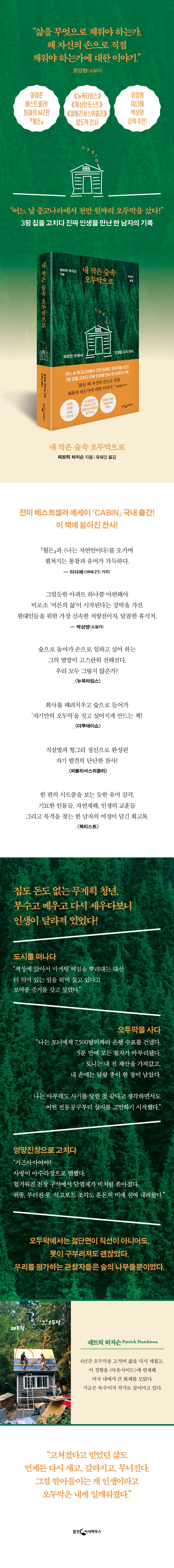 ÀÌ Ã¥Àº 6³â°£ ¿ÀµÎ¸·À» °íÄ¡¸ç µ¿½Ã¿¡ ÀÚ½ÅÀÇ »îÀ» °íÃÄ ³ª°£ ÇÑ Ã»³âÀÇ È¸°í·ÏÀÌ´Ù. ½£¼Ó »ýȰÀÇ ³¶¸¸°ú Çö½ÇÀ» À¯ÄèÇÏ°Ô ±×·Á³½ ±×ÀÇ ±ÛÀº ¾Æ¿ôµµ¾î ¸Å°ÅÁø ¡¶¾Æ¿ô»çÀ̵塷¿¡ ¿¬ÀçµÇ¸ç Å« ÈÁ¦¸¦ ¸ð¾Ò´Ù. µ¶ÀÚµéÀÇ Ãâ°£ ¿äûÀÌ ¼âµµÇØ ¿¬Àç ±ÛÀ» ¿«Àº °ÍÀÌ ¹Ù·Î ÀÌ Ã¥ ¡º³» ÀÛÀº ½£¼Ó ¿ÀµÎ¸·À¸·Î(CABIN)¡»ÀÌ´Ù. ¹Ì±¹¿¡¼ Ãâ°£ Áï½Ã ¾Æ¸¶Á¸ º£½ºÆ®¼¿·¯¿¡ ¿Ã¶úÀ¸¸ç ¡¶´º¿åŸÀÓ½º¡·¿Í ¡¶¿ö½ÌÅÏÆ÷½ºÆ®¡·¿¡¼ ±ØÂùÀ» ¹Þ¾Ò´Ù.