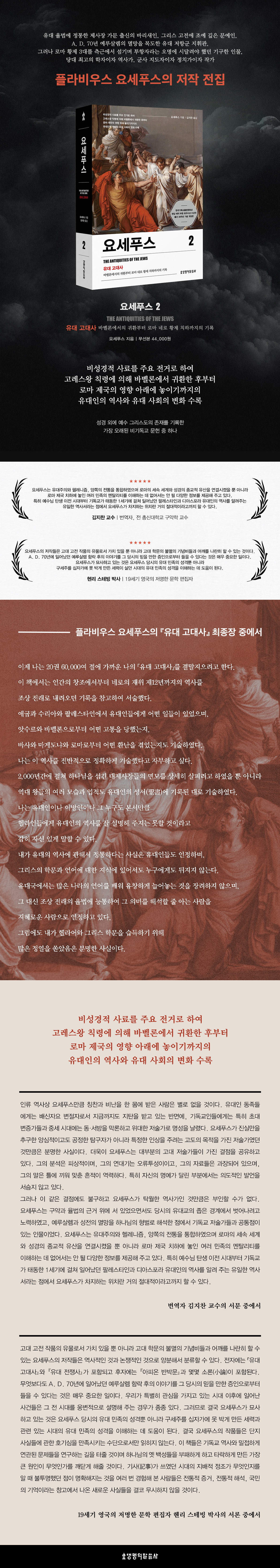 °í´ë °íÀü ÀÛǰÀÇ À¯¹°·Î¼ °¡Ä¡ ÀÖÀ» »Ó ¾Æ´Ï¶ó °í´ë Çй®ÀÇ ºÒ¸êÀÇ ±â³äºñµé°ú ¾î±ú¸¦ ³ª¶õÈ÷ ÇÒ ¼ö ÀÖ´Â ¿ä¼¼Çª½ºÀÇ ÀúÀÛµéÀº ¿ª»çÀûÀÎ °Í°ú ³íÀïÀûÀÎ °ÍÀ¸·Î ¾çºÐÇØ¼ ºÐ·ùÇÒ ¼ö ÀÖ´Ù. ÀüÀÚ¿¡´Â ¡¸À¯´ë °í´ë»ç¡¹¿Í ¡¸À¯´ë ÀüÀï»ç¡¹°¡ Æ÷ÇԵǰí ÈÄÀÚ¿¡´Â ¡¸¾ÆÇǿ ¹Ý¹Ú¹®¡¹°ú ¸î¸î ¼Ò·Ð(á³Öå)ÀÌ Æ÷ÇԵȴÙ. ¹«¾ùº¸´Ùµµ A. D. 70³â¿¡ ÀϾ´ø ¿¹·ç»ì·½ ÇÔ¶ô ÈÄÀÇ À̾߱⸦ ±× ´ç½ÃÀÇ ¹ÏÀ» ¸¸ÇÑ ÁõÀÎÀ¸·ÎºÎÅÍ µéÀ» ¼ö ÀÖ´Ù´Â °ÍÀº ¸Å¿ì Áß¿äÇÑ ÀÏÀÌ´Ù. ¿ì¸®°¡ Ưº°È÷ °ü½ÉÀ» °¡Áö°í ÀÖ´Â ½Ã´ë ÀÌÈÄ¿¡ ÀÏ¾î³ »ç°ÇµéÀº ±× Àü ½Ã´ë¸¦ ¿õº¯ÀûÀ¸·Î ¼³¸íÇØ ÁÖ´Â °æ¿ì°¡ Á¾Á¾ ÀÖ´Ù. ±×·¯¹Ç·Î °á±¹ ¿ä¼¼Çª½º°¡ ¹¦»çÇϰí ÀÖ´Â °ÍÀº ¿ä¼¼Çª½º ´ç½ÃÀÇ À¯´ë ¹ÎÁ·ÀÇ ¼º°Ý»Ó ¾Æ´Ï¶ó ±¸¼¼ÁÖ¸¦ ½ÊÀÚ°¡¿¡ ¸ø ¹Ú°Ô ¸¸µç ¼¼·Â°ú °ü·Ã ÀÖ´Â ½Ã´ëÀÇ À¯´ë ¹ÎÁ·ÀÇ ¼º°ÝÀ» ÀÌÇØÇÏ´Â µ¥ µµ¿òÀÌ µÈ´Ù. °á±¹ ¿ä¼¼Çª½ºÀÇ ÀÛǰµéÀº ´ÜÁö »ç½Çµé¿¡ °üÇÑ È£±â½ÉÀ» ¸¸Á·½ÃŰ´Â ¼ö´ÜÀ¸·Î¼¸¸ ÀÐÈ÷Áö ¾Ê´Â´Ù. ÀÌ Ã¥µéÀº ±âµ¶±³ ¿ª»ç¿Í ¹ÐÁ¢ÇÏ°Ô ¿¬°üµÈ ¹®Á¦µéÀ» ¿¬±¸ÇÏ´Â ±æÀ» ÅÍÁÙ °ÍÀ̸ç Çϳª´ÔÀÇ ¿¾ ¹é¼ºµéÀ» ºÎÆÐÇÏ°Ô Çϰí Ÿ¶ôÇÏ°Ô ¸¸µç °¡Àå Å« ¿øÀÎÀÌ ¹«¾ùÀΰ¡¸¦ ±ú´Ý°Ô ÇØÁÙ °ÍÀÌ´Ù. ±â»ç(ÑÀÞÀ)°¡ ¾²¿´´ø ½Ã´ëÀÇ Áö¹èÀû Á¤Á¶°¡ ¹«¾ùÀÎÁö¸¦ ¾Ë ¶§ ºÒÅõ¸íÇß´ø Á¡ÀÌ ¸íÈ®ÇØÁö´Â °ÍÀ» ¿©·¯ ¹ø °æÇèÇØ º» »ç¶÷µéÀº ÀüÅëÀû Áõ°Å, ÀüÅëÀû ÇØ¼®, ±¹¹ÎÀÇ ±â¾ïÀ̶ó´Â â°í¿¡¼ ³ª¿Â »õ·Î¿î »ç½ÇµéÀ» °áÄÚ ¹«½ÃÇÏÁö ¾ÊÀ» °ÍÀÌ´Ù.