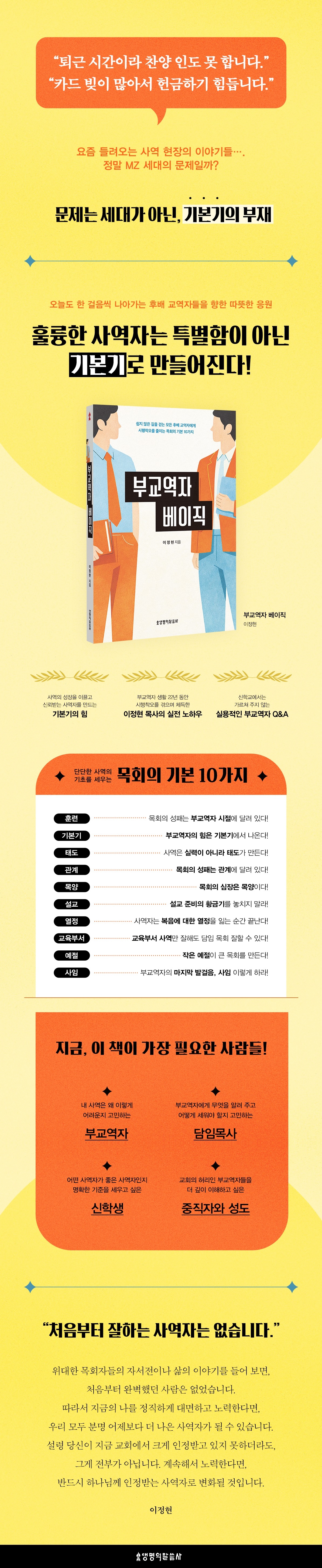 ÀÌ Ã¥Àº ºÎ±³¿ªÀڵ鿡°Ô Á¤¸» ÇÊ¿äÇÑ °ÍÀÌ ¹«¾ùÀÎÁö¸¦ °í¹ÎÇÏ´Â µ¥¼ Ãâ¹ßÇß´Ù. µû¶ó¼ ¾î¶² Ưº°ÇÔÀ» °Á¶Çϱ⺸´Ù, ±³¿ªÀÚ »ç¿ªÀÇ ±âº»À» Á¤¸®ÇÏ´Â µ¥ ¸ñÀûÀÌ ÀÖ´Ù. ºÎ±³¿ªÀÚ ½ÃÀý¿£ ¡®³»°¡ Á¤¸» ÀßÇϰí ÀÖ´Â °É±î? ¾ÕÀ¸·Î´Â ¾î¶»°Ô ÇØ¾ß ÇÏÁö?¡¯¶ó´Â »ý°¢¿¡ È¥¶õ½º·¯¿ï ¼öµµ ÀÖ´Ù. ÀÌ¿¡ ÀúÀÚ´Â ¿ÀÁ÷ ¡®¿ì¸®³ª¶ó ºÎ±³¿ªÀڵ鿡°Ô µµ¿òÀÌ µÇ¸é ÁÁ°Ú´Ù! ³ª¿Í °°Àº ½ÃÇàÂø¿À°¡ Àû¾úÀ¸¸é ÁÁ°Ú´Ù! ±×·¡¼ ¸ðµç ±³È¸°¡ ´õ¿í °Ç°ÇÏ°Ô ¼¼¿öÁö¸é ÁÁ°Ú´Ù!¡¯¶ó´Â ¸¶À½À» ´ã¾Æ, ´Ü¼øÇÑ Á¶¾ðÀÌ ¾Æ´Ñ »ý»ýÇÑ ¸ñȸ ÇöÀåÀÇ À̾߱⸦ ÀüÇØ ÁØ´Ù.