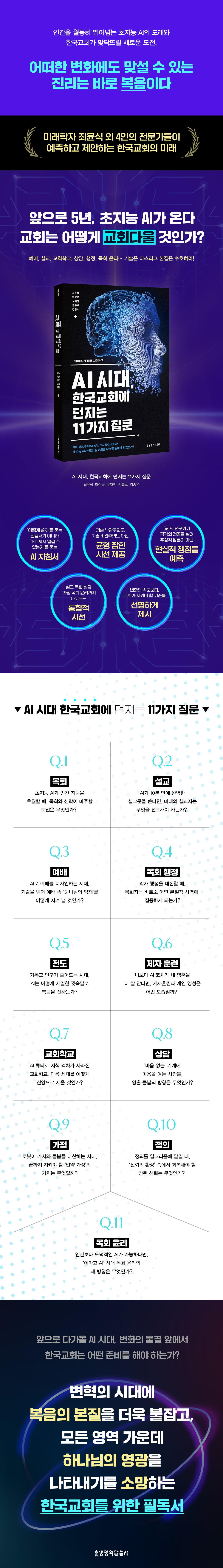 Ã¥¼ÓÀ¸·ÎÀÌ Ã¥Àº ±â¼úÀ» Âù¾çÇϰųª °æ°èÇϱâ À§ÇÑ Ã¥ÀÌ ¾Æ´Ï´Ù. ÀÌ Ã¥Àº AI¶ó´Â °Å´ëÇÑ º¯È ¾Õ¿¡¼ Çѱ¹±³È¸°¡ ±æÀ» ÀÒÁö ¾Êµµ·Ï, Çϳª´ÔÀÇ Á¸Àç¿Í ¸»¾¸ ¾Õ¿¡ °â¼ÕÈ÷ ¿ì¸®ÀÇ Çö½ÇÀ» µ¹¾Æº¸¸ç ¹Ì·¡ ¸ñȸ¸¦ ÁغñÇÏ´Â ÀÛ¾÷ÀÌ´Ù. ÀÌÁ¦ ´ç½ÅÀº 5¸íÀÇ ÀúÀÚµé°ú ´ëÈÇÏ¸é¼ 11°¡ÁöÀÇ ÁÖ¿ä Áú¹®µé¿¡ ´ëÇØ ¼ºÂûÇÒ °ÍÀÌ´Ù. ±× °¡¿îµ¥ ´ç½ÅÀº °á±¹ ÇϳªÀÇ ±Ã±ØÀûÀÎ Áú¹®°ú ¸¶ÁÖÇÏ°Ô µÉ °ÍÀÌ´Ù. ¡°AI ½Ã´ë, ±³È¸´Â ¾î¶»°Ô ±³È¸´Ù¿ï °ÍÀΰ¡?¡± _¡®µé¾î°¡´Â ±Û¡¯ Áß¿¡¼, p.9