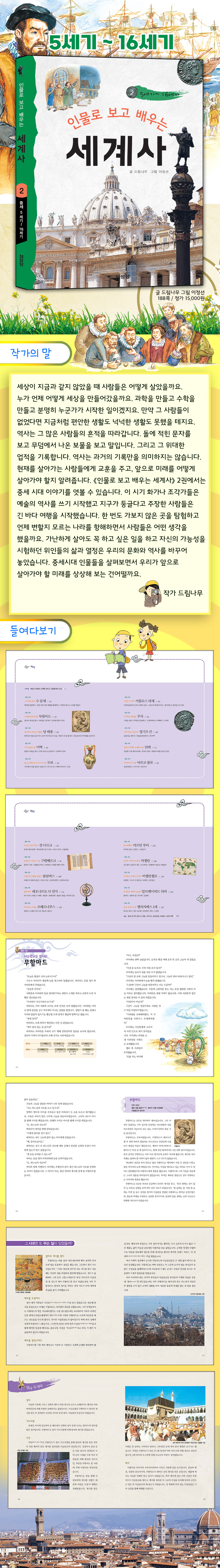 ¼¼»ó¿¡´Â ¼ö¸¹Àº »ç¶÷µéÀÌ »ì´Ù°¡ °©´Ï´Ù. ¾î¶² »ç¶÷µéÀº À̸§µµ ¾øÀÌ »ì´Ù°¡ °¡Áö¸¸ ¾î¶² »ç¶÷µéÀº ±× ÈçÀûÀ» ³²±â°í °¡Áö¿ä. ¼¼»óÀÌ Áö±Ý°ú °°ÀÌ ¾Ê¾ÒÀ» ¶§ »ç¶÷µéÀº ¾î¶»°Ô »ì¾ÒÀ»±î¿ä. ´©°¡ ¾ðÁ¦ ¾î¶»°Ô ¼¼»óÀ» ¸¸µé¾î °¬À»±î¿ä. °úÇÐÀ» ¸¸µé°í ¼öÇÐÀ» ¸¸µé°í ºÐ¸íÈ÷ ´©±º°¡°¡ ½ÃÀÛÇÑ ÀÏÀ̰ÚÁö¿ä. ¸¸¾à ±× »ç¶÷µéÀÌ ¾ø¾ú´Ù¸é Áö±Ýó·³ Æí¾ÈÇÑ »ýȰµµ ³Ë³ËÇÑ »ýȰµµ ¸øÇßÀ» Å×Áö¿ä. ¿ª»ç´Â ±× ¸¹Àº »ç¶÷µéÀÇ ÈçÀûÀ» µû¶ó°©´Ï´Ù. µ¹¿¡ ÀûÈù ¹®ÀÚ¸¦ º¸°í ¹«´ý¿¡¼ ³ª¿Â º¸¹°À» º¸°í ¸»ÀÔ´Ï´Ù. ±×¸®°í ±× À§´ëÇÑ ¾÷ÀûÀ» ±â·ÏÇÕ´Ï´Ù. ¿ª»ç´Â °ú°ÅÀÇ ±â·Ï¸¸À» ÀǹÌÇÏÁö´Â ¾Ê½À´Ï´Ù. ÇöÀ縦 »ì¾Æ°¡´Â »ç¶÷µé¿¡°Ô ±³ÈÆÀ» ÁÖ°í, ¾ÕÀ¸·Î ¹Ì·¡¸¦ ¾î¶»°Ô »ì¾Æ°¡¾ß ÇÒ Áö ¾Ë·ÁÁÝ´Ï´Ù. <Àι°·Î º¸°í ¹è¿ì´Â ¼¼°è»ç> 2±Ç¿¡¼´Â Áß¼¼ 5¼¼±âºÎÅÍ 16¼¼±â±îÁö À̾߱⸦ ¿³º¼ ¼ö ÀÖ½À´Ï´Ù. ÀÌ ½Ã±â Ȱ¡³ª Á¶°¢°¡µéÀº ¿¹¼úÀÇ ¿ª»ç¸¦ ¾²±â ½ÃÀÛÇß°í Áö±¸°¡ µÕ±Û´Ù°í ÁÖÀåÇÑ »ç¶÷µéÀº ±ä ¹Ù´Ù¿©ÇàÀ» ½ÃÀÛÇß½À´Ï´Ù. ÇÑ ¹øµµ °¡º¸Áö ¾ÊÀº °÷À» ŽÇèÇÏ°í ¾ðÁ¦ º¯ÇÒÁö ¸ð¸£´Â ³ª¶ó¸¦ ÇâÇØÇÏ¸é¼ »ç¶÷µéÀº ¾î¶² »ý°¢À» ÇßÀ»±î¿ä. °¡³ÇÏ°Ô »ì¾Æµµ ²À ÇÏ°í ½ÍÀº ÀÏÀ» Çϰí ÀÚ½ÅÀÇ °¡´É¼ºÀ» ½ÃÇèÇÏ´ø À§ÀεéÀÇ »î°ú ¿Á¤Àº ¿ì¸®ÀÇ ¹®È¿Í ¿ª»ç¸¦ ¹Ù²Ù¾î ³õ¾Ò½À´Ï´Ù.