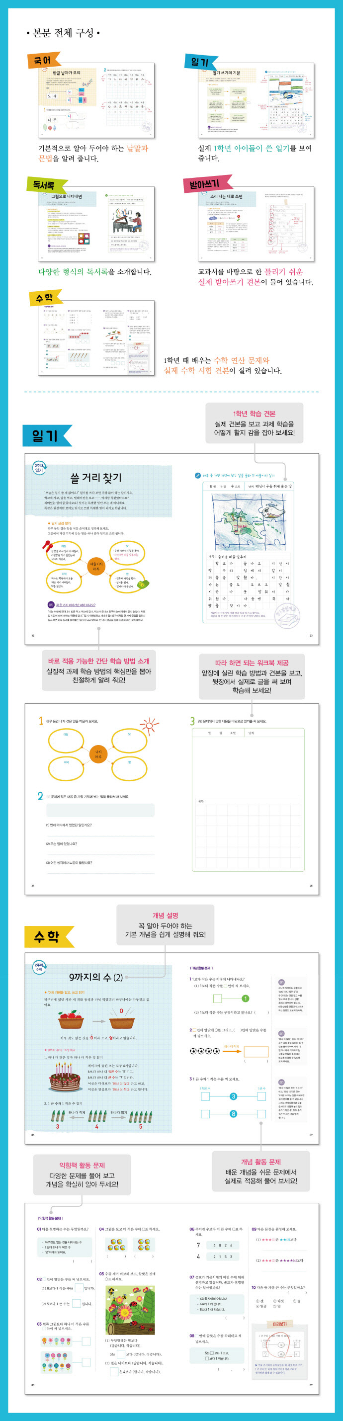 °¢ °úÁ¦ ÇнÀ¿¡´Â ½ÇÁ¦ 1Çгâ Ä£±¸µéÀÇ ÇнÀ °ßº»°ú ½º½º·Î ÇØ º¼ ¼ö ÀÖ´Â ¿öÅ©ºÏÀÌ ÇÔ²² µé¾î ÀÖ´Ù. ÇнÀ °ßº»À» º¸¸é¼ °úÁ¦ ÇнÀÀ» ¾î¶»°Ô ÇÒ °ÍÀΰ¡¿¡ ´ëÇÑ °¨À» Àâ°í, ¹è¿ì°í ÀÍÇô µÎ¾î¾ß ÇÒ °ÍÀ» ÇÑ´«¿¡ ¾Ë ¼ö ÀÖ´Ù. ´ÜÁö º¸°í ³¡³»´Â °Ô ¾Æ´Ï¶ó ½ÇÁ¦ °úÁ¦ ÇнÀ üÇèÀ» Á÷Á¢ ÇØ º¸´Â ¿öÅ©ºÏÀÌ µé¾î ÀÖ¾î ÇнÀ°ú ¼÷Á¦ °¨°¢À» ÀÍÈú ¼ö ÀÖ´Ù.