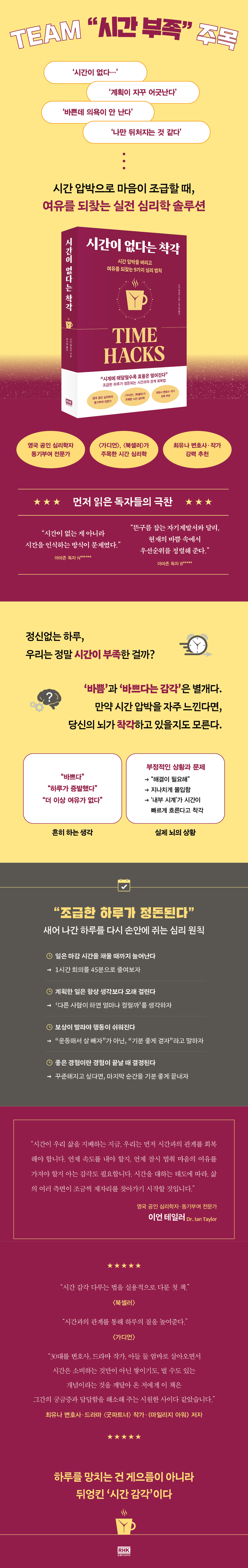 ½Ã°£ÀÌ ºÎÁ·ÇÏ´Ù´Â Á¶±ÞÇÔ, ±× Á¶±ÞÇÔÀÌ ¸¸µå´Â ¾Ð¹Ú°¨, ¾Ð¹Ú°¨ÀÌ ºÒ·¯¿À´Â ¹Ýº¹ÀûÀÎ ½Ç¼ö¿Í °íÅë. ÀÌ ¾Ç¼øÈ¯À» ²÷À¸·Á¸é ½Ã°£°ú ¸Î´Â °ü°èºÎÅÍ ´Ù½Ã ¼³Á¤ÇÒ Çʿ䰡 ÀÖ´Ù. ¡¶½Ã°£ÀÌ ¾ø´Ù´Â Âø°¢¡·Àº ¿ì¸®°¡ ÈçÈ÷ °Þ´Â ½Ã°£¿¡ °üÇÑ ½É¸®Àû Âø°¢À» ¤¾î ÁÖ´Â µ¿½Ã¿¡, ±×°ÍÀ» ´Ù·ç´Â ½Ç¿ëÀûÀÎ ÇØ¹ý±îÁö Á¦½ÃÇÑ´Ù.