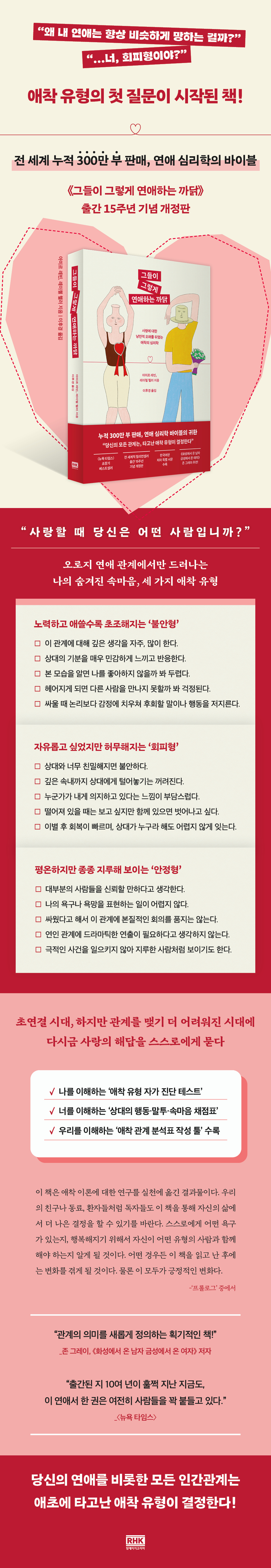 À̹ø °³Á¤ÆÇÀº Ç¥Áö¿Í º»¹® Àüü¸¦ °¨°¢ÀûÀ¸·Î ÀçµðÀÚÀÎÇß´Ù. ¡®¼·Î ´Ù¸¥ ÃãÀ» Ãß°í ÀÖ´Â ¿¬Àε顯À» ¹¦»çÇÑ Å°¹Ì ÀÛ°¡ÀÇ ÀÏ·¯½ºÆ®¸¦ ´ã¾Æ³½ Ç¥Áö, ´õ ÀÛ°í °¡º¿öÁø ÆÇÇü, °¡µ¶¼ºÀ» ³ôÀÎ ¹®Àåµé°ú ÇÔ²² Çѱ¹¾îÆÇ °³Á¤À» ±â³äÇÏ´Â ÀúÀÚÀÇ Æ¯º° ¼¹®À» ¼ö·ÏÇß´Ù. 15³â Àü ¡°´ç½ÅÀÇ ¸ðµç ¿¬¾Ö´Â Ÿ°í³ ¾ÖÂø À¯ÇüÀÌ °áÁ¤ÇÑ´Ù¡±´Â ÆÄ°ÝÀûÀÎ ¼±¾ðÀ¸·Î º£½ºÆ®¼¿·¯ÀÌÀÚ ½ºÅ׵𼿷¯·Î µî±ØÇÑ ÀÌ Ã¥Àº ¿¬¾Ö¶ó´Â ¿µ¿ªÀ» ¡®¿î¡¯À̳ª ¡®»ó´ëÀÇ ¼ºÇ⡯ÀÌ ¾Æ´Ï¶ó, °úÇÐÀû ±Ù°Å¸¦ Áö´Ñ ¾ÖÂø À¯ÇüÀ¸·Î ¹Ù¶óº¸°Ô ¸¸µç´Ù. ´ç½ÅÀÌ Áö±Ý ´©±¸¸¦ ¸¸³ª°í ÀÖµç, ¶Ç´Â Çì¾îÁ³µç, ȤÀº ¾ÆÁ÷ È¥ÀÚÀÎ °Ô ÆíÇÏ´Ù ÇÏ´õ¶óµµ ÀÌ Ã¥À» µ¤´Â ¼ø°£ ±×°£ ÀÚ½ÅÀÇ °ü°è¿¡¼ ¹«¾ùÀÌ ¹Ýº¹µÇ°í ÀÖ¾ú´ÂÁö¸¦ ±ú´ÞÀ» ¼ö ÀÖ´Ù. ¡¶±×µéÀÌ ±×·¸°Ô ¿¬¾ÖÇÏ´Â ±î´ß¡·Àº ½É¸®ÇÐ À̷аú »ç·Ê ºÐ¼®¿¡ ±×Ä¡Áö ¾Ê°í, ½ÇÁ¦ °ü°èÀÇ ÀÛµ¿ ¿ø¸®¸¦ ÇØºÎÇÏ´Â °¡Àå Çö½ÇÀûÀÎ ¿¬¾Ö ¸Å´º¾óÀÌ µÇ¾îÁÙ °ÍÀÌ´Ù.