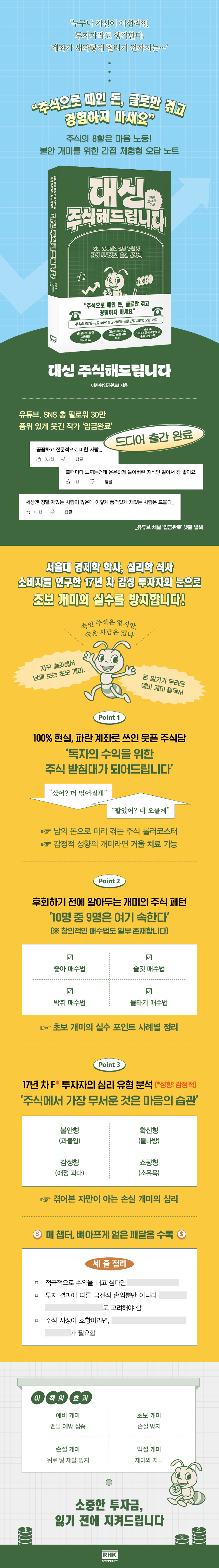 ÀÌ ¹®Á¦¸¦ ÇØ°áÇÒ ÁÖ½Ä Ã¥ÀÌ µîÀåÇß´Ù. ¡¶´ë½Å ÁÖ½ÄÇØµå¸³´Ï´Ù¡·´Â ½ÃÁß µµ¼¿¡¼ ÈçÈ÷ º¸ÀÌ´Â ¼º°ø ¹æÁ¤½ÄÀÌ ¾Æ´Ñ, ½ÇÆÐÀÇ ¿À´ä ¸ñ·ÏÀ» ¼¼»ó¿¡ ³»³õ´Â´Ù. ±âÁ¸ÀÇ ¼º°ø¹ý µµ¼°¡ ¡°ÀÌ·¸°Ô Çϼ¼¿ä¡±¶ó°í ¸»ÇÑ´Ù¸é, ÀÌ Ã¥Àº ¡°ÀÌ·¸°Ô´Â Àý´ë ÇÏÁö ¸»°í Àú·¸°Ô Çϼ¼¿ä¡±¶ó°í ÀÏ·¯ÁØ´Ù. ¿À´ä ³ëÆ®¸¦ ¹Ì¸® ½áÁÖ´Â ¼ÀÀÌ´Ù. ÃÑ 30¸¸ ÆÈ·Î¿öÀÇ ÁöÁö¸¦ ¹Þ´Â ¡®Ç°À§ ÀÖ°Ô ¿ô±ä¡¯ ÀÛ°¡ À̹μö(ÀԱݿϷá)´Â 17³â Â÷ ÅõÀÚÀڷμ »óÀåÆóÁö, ¹°Å¸±â, ¾à -60% ¼öÀÍÀÇ °æÇèÀ» ´ã¾Æ °ø°¨ÀÇ ´«¹°°ú À¯ÄèÇÔÀÇ Ä«Å¸¸£½Ã½º·Î Á¡Ã¶µÈ ÁÖ½Ä ÅõÀÚ¸¦ ȸ°íÇÑ´Ù. ¼ÒºñÀÚ¸¦ ¿¬±¸ÇÑ ÀÌ·ÂÀ» °¡Áø ±×°¡ À̹ø¿£ ½º½º·Î¸¦ ¿¬±¸Çϸç, ÁÖ½ÄÀ» ½ÃÀÛÇÑ ¼ø°£À¸·Î µÇµ¹¾Æ°¡ Ãʺ¸ °³¹Ì°¡ ÀÚÄ© Çϱ⠽¬¿î ½Ç¼ö¿Í ¸¶À½°í»ýÀ» ´ë½Å ¼öÇàÇÑ´Ù.