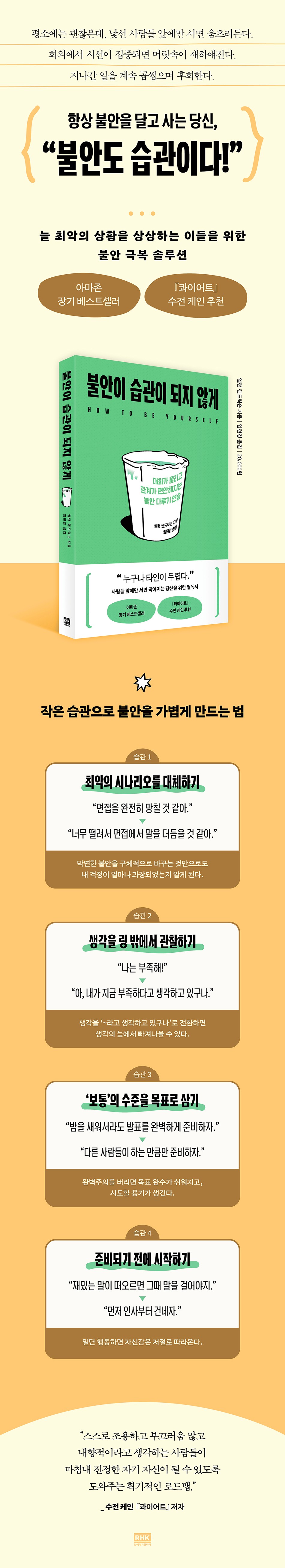¡ººÒ¾ÈÀÌ ½À°üÀÌ µÇÁö ¾Ê°Ô(¿øÁ¦: How to Be Yourself)¡»´Â ±× ¸ðµç °ÍÀ» ´ãÀº Ã¥ÀÌ´Ù. ÀÌ Ã¥Àº ºÒ¾ÈÀ» ´À³¢´Â ´ç½Å¿¡°Ô´Â ¾Æ¹«·± ¹®Á¦°¡ ¾øÀ¸¸ç, ÀÌ¹Ì ¿ì¸® ¾È¿¡ À̸¦ ±Øº¹Çϰí ÇìÃÄ ³ª°¡´Â µ¥ ÇÊ¿äÇÑ ¸ðµç °ÍÀÌ Á¸ÀçÇÑ´Ù°í À̾߱âÇÑ´Ù. ¼º°ÝÀ» ¹Ù²Ü Çʿ䵵, ÀÚ½ÅÀ» ¾ïÁö·Î ²Ù¸ç³¾ Çʿ䵵 ¾ø´Ù. ÀÌ¹Ì °¡Áö°í ÀÖ´Â ´É·ÂÀ» ²ôÁý¾î³»±â¸¸ ÇÏ¸é µÈ´Ù. ¿À·§µ¿¾È »çȸºÒ¾ÈÀ» °ÞÀº ÀúÀÚ´Â ´Ù¸¥ À̵éÀº °°Àº °íÅëÀ» ¹Ýº¹ÇÏÁö ¾Ê¾ÒÀ¸¸é ÇÏ´Â ¹Ù¶÷À¸·Î ÀÌ Ã¥À» ½è´Ù.