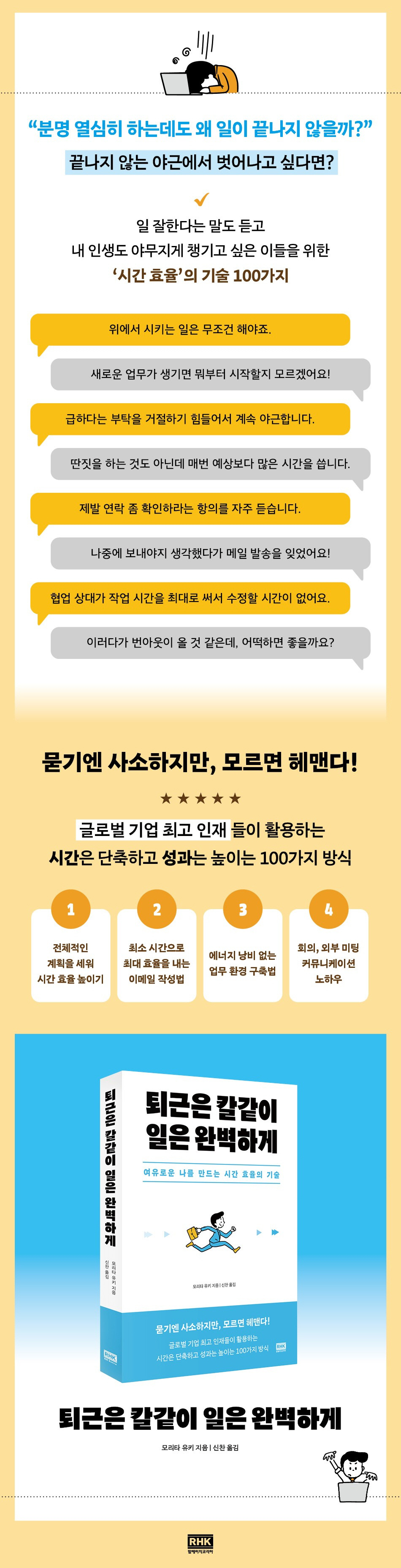 ¡¶Åð±ÙÀº Ä®°°ÀÌ, ÀÏÀº ¿Ïº®Çϰԡ·ÀÇ ÀúÀÚ ¸ð¸®Å¸ À¯Å°´Â 20¿© ³â°£ ¹ÙŬ·¹ÀÌÁî, µå·¹½º³Ê Ŭ¶óÀοöÆ®(Çö ¾Ë¸®¾ÈÃ÷), ¾Æ¸Þ¸®Ä ÀÎÅͳ»¼Å³Î ±×·ì µî ±Û·Î¹ú ±ÝÀ¶ ±â¾÷ÀÇ ÀÓ¿øµéÀ» º¸ÁÂÇÏ¸ç ¹è¿î ½Ã°£ È¿À²ÀÇ ±â¼úÀ» ÀÌ Ã¥¿¡ ´ã¾Ò´Ù. ³¡³¯ ÁÙ ¸ð¸£´Â ¾ß±Ù¿¡ ÁöÄ£ Á÷ÀåÀÎÀ̶ó¸é °°Àº ½Ã°£À¸·Îµµ ´õ ¸¹Àº ÀÏÀ» ÇØ³»´Â ½Ã°£ È¿À²ÀÇ ±â¼úÀ» »ìÆìº¸ÀÚ. Ä¿¹Â´ÏÄÉÀÌ¼Ç ¿À·ù¸¦ ÁÙÀÌ´Â À̸ÞÀÏ ÀÛ¼º¹ýºÎÅÍ ¿ÜºÎ ¹ÌÆÃÀ» ÇÑ ¹ø¿¡ ¼º»ç½ÃŰ´Â ¹æ¹ý±îÁö. ±Ù¹« ½Ã°£Àº Àý¹ÝÀ¸·Î ÁÙÀ̰í, ¼º°ú´Â µÎ ¹è·Î ´Ã¸®´Â ¾÷¹« ³ëÇÏ¿ì 100°¡Áö¸¦ Á¦½ÃÇϴ åÀÌ´Ù.