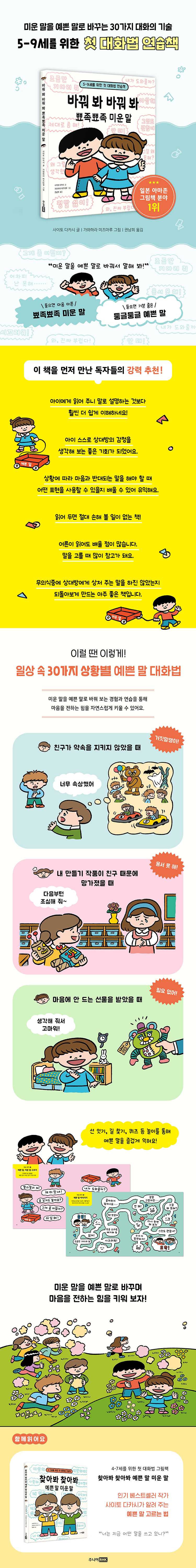 ¡¶¹Ù²ã ºÁ ¹Ù²ã ºÁ »ÏÁ·»ÏÁ· ¹Ì¿î ¸»¡·Àº ´Ü¼øÈ÷ ¾ð¾î ½À°üÀÇ Á߿伺À» ¾Ë·Á ÁÖ´Â µ¥ ±×Ä¡Áö ¾Ê°í, ¾ÆÀÌ ½º½º·Î ¸»Åõ¸¦ ¹Ù²Ù¸ç Àڱ⸸ÀÇ ¾ð¾î ½À°üÀ» ±æ·¯ °¥ ¼ö ÀÖµµ·Ï µ½´Â ½ÇÁúÀûÀÎ ¿¬½ÀÃ¥ÀÌ´Ù. Ä£±¸¿Í ÀǰßÀÌ ´Þ¶ó ´ÙÅø ¶§, Ä£±¸°¡ ¾à¼ÓÀ» ÁöŰÁö ¾Ê¾Æ ¼Ó»óÇÒ ¶§, ½Ç¼öÇØ¼ ³î¸²´çÇÒ ¶§ µî ¾ÆÀ̵éÀÌ Àϻ󿡼 ÈçÈ÷ °Þ´Â °¥µî »óȲºÎÅÍ, °¡°Ô ¾Õ¿¡¼ ¼ø¼¸¦ ±â´Ù¸®°Å³ª ¸¶À½¿¡ µéÁö ¾Ê´Â ¼±¹°À» ¹Þ¾ÒÀ» ¶§Ã³·³ »çȸÀû ¸Æ¶ô¿¡¼ ¸¶ÁÖÇÒ ¼ö ÀÖ´Â ´Ù¾çÇÑ ¼ø°£±îÁö ±¸Ã¼ÀûÀÎ »ç·Ê¸¦ ´ã°í ÀÖ´Ù. ÀÌ Ã¥Àº ±×·± »óȲ¿¡¼ ¾ÆÀ̰¡ ³»¹ñ±â ½¬¿î ¡®¹Ì¿î ¸»¡¯°ú ¹Ù²Ù¾î ¾µ ¼ö ÀÖ´Â ¡®¿¹»Û ¸»¡¯À» ÇÔ²² Á¦½ÃÇØ °ø°¨°ú °¨Á¤ Ç¥ÇöÀÇ ¾ð¾î¸¦ Çϳª¾¿ ¹è¿ö ³ª°¡µµ·Ï À¯µµÇÑ´Ù. ¿¹ÄÁ´ë Ä£±¸°¡ ¾à¼ÓÀ» ÁöŰÁö ¾Ê¾ÒÀ» ¶§ ¡°°ÅÁþ¸»ÀïÀÌ!¡±¶ó°í ³»¹ñ´Â ´ë½Å, ¡°³Ê¹« ¼Ó»óÇß¾î.¡±¶ó°í ÀÚ½ÅÀÇ °¨Á¤À» ¼ÖÁ÷È÷ Ç¥ÇöÇØ º¸ÀÚ°í Á¦¾ÈÇÏ´Â ½ÄÀÌ´Ù.