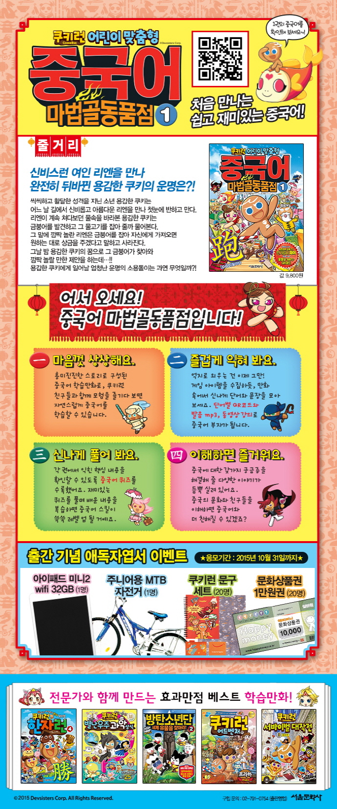 Ã¥¼Ò°³Èï¹ÌÁøÁøÇÑ ½ºÅ丮·Î ±¸¼ºµÈ Áß±¹¾î ÇнÀ¸¸È·Î, ÄíŰ·± Ä£±¸µé°ú ÇÔ²² ¸ðÇèÀ» Áñ±â´Ù º¸¸é ÀÚ¿¬½º·´°Ô Áß±¹¾î¸¦ ÇнÀÇÒ ¼ö ÀÖ½À´Ï´Ù. ¶ÇÇÑ Àç¹ÌÀÖ°Ô ÇнÀÇÒ ¼ö ÀÖµµ·Ï °ÔÀÓ ¾ÆÀÌÅÛÀ» ¼öÁýÇϵí, ¸¸È ¼Ó¿¡¼ ½Å³ª°Ô ´Ü¾î¿Í ¹®ÀåÀ» ¸ðÀ» ¼ö ÀÖ¾î¿ä. °÷°÷¿¡ ÀÖ´Â QRÄÚµå·Î ½±°í Àç¹ÌÀÖ°Ô Áß±¹¾î ¹ßÀ½À» µû¶óÇØ º¸¼¼¿ä. °¢ ±Ç ¸¶Áö¸·¿¡ ¼ö·ÏÇÑ Çٽɳ»¿ëÀº ³»¿ëÀ» È®ÀÎÇÒ ¼ö ÀÖ´Â ÄûÁî°¡ ÀÖ¾î ³»¿ëÀ» º¹½ÀÇÒ ¼ö ÀÖÀ¸¸ç, Áß±¹¿¡ ´ëÇÑ °®°¡Áö ±Ã±ÝÁõÀ» ÇØ°áÇØ ÁÙ ´Ù¾çÇÑ À̾߱â±îÁö °¡µæ ´ã¾Ò½À´Ï´Ù.
