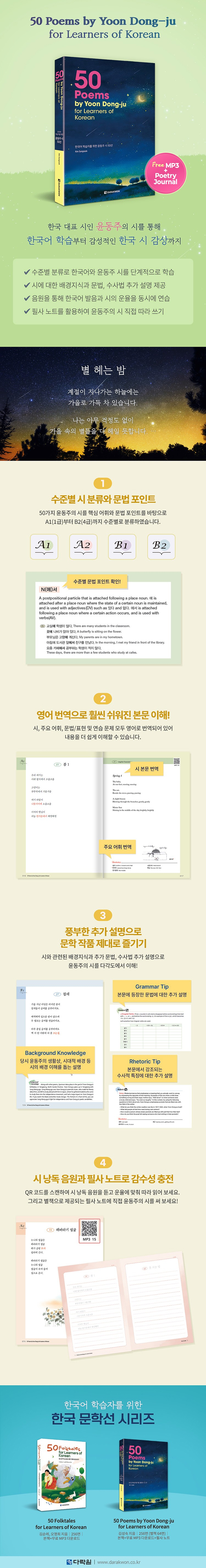ÀÌ Ã¥Àº À±µ¿ÁÖÀÇ ½Ã Áß¿¡¼ ÃÊ~Áß±Þ Çѱ¹¾î ÇнÀÀÚ¿¡°Ô ÀûÀýÇÑ ½Ã 50ÆíÀ» ¼±º°ÇÏ¿© ´Ü°èÀûÀ¸·Î Á¦½ÃÇϰí ÀÖ´Ù. Àüü ½ÃµéÀº ¿µ¾î·Î ¹ø¿ªµÇ¾î ÀÖ¾î Çѱ¹¾î°¡ ´É¼÷ÇÏÁö ¾ÊÀº ÇнÀÀÚµµ ½Ã Àб⿡ µµÀüÇÏ°í ³»¿ëÀ» ÀÌÇØÇÒ ¼ö ÀÖµµ·Ï µµ¿Ô´Ù. ½Ã¿¡ µîÀåÇÏ´Â ÁÖ¿ä ¾îÈÖ´Â º°µµ·Î ¿µ¾î ¹ø¿ª°ú ÇÔ²² Á¦½ÃµÇ¾î Àֱ⠶§¹®¿¡ ÇнÀÀÚ°¡ À̸¦ Ȱ¿ëÇÏ¿© ½º½º·Î ½Ã¸¦ ÇØ¼®ÇØ º¼ ¼öµµ ÀÖ´Ù.
