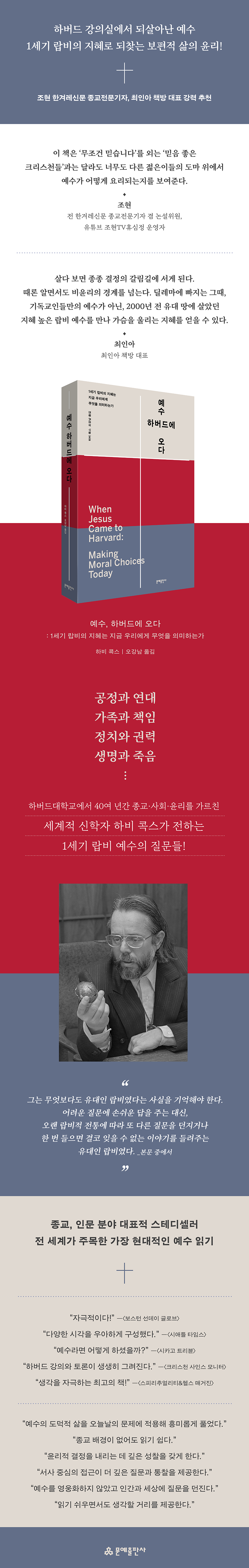 ±¹³» Á¾±³, Àι® ºÐ¾ßÀÇ ´ëÇ¥ÀûÀÎ ½ºÅ׵𼿷¯·Î ¿À·§µ¿¾È ÀÐÇô¿Â ÇϺñ ÄÛ½ºÀÇ ¡¶¿¹¼ö, ÇϹöµå¿¡ ¿À´Ù(When Jesus Came to Harvard)¡·°¡ Çѱ¹¾î °³Á¤ÆÇÀ¸·Î »õ·Ó°Ô Ãâ°£µÆ´Ù. ¡¶¿¹¼ö, ÇϹöµå¿¡ ¿À´Ù¡·´Â ¼¼°èÀû ½ÅÇÐÀÚÀÌÀÚ »çȸÀ±¸® »ç»ó°¡ÀÎ ÇϺñ ÄÛ½º°¡ ÇϹöµå´ëÇб³ °Àǽǿ¡¼ Çлýµé°ú ÇÔ²² ¿¹¼öÀÇ »î°ú °¡¸£Ä§À» ´Ù½Ã Àаí Áú¹®ÇÑ ±â·ÏÀÌ´Ù. ÀÌ Ã¥Àº ¿¹¼ö¸¦ ´Ü¼øÇÑ ½Å¾ÓÀÇ ´ë»óÀ̳ª Á¾±³Àû »ó¡À¸·Î ´Ù·çÁö ¾Ê°í, ¿À´ÃÀÇ »çȸ¿Í »îÀ» ÇâÇØ À±¸®Àû °á´ÜÀ» ¿ä±¸ÇÏ´Â Áú¹®ÀÚ·Î µÇ»ì·Á³½´Ù. À̹ø °³Á¤ÆÇ¿¡¼´Â ±âÁ¸ ¹ø¿ª¹®À» ÇöÀç µ¶ÀÚÀÇ ¾ð¾î °¨°¢¿¡ ¸Â°Ô ´Ùµë°í Á¾±³, À±¸®, öÇÐ ºÐ¾ßÀÇ Çö´ëÀû ¿ë¾î ü°è¸¦ ¹Ý¿µÇØ °¡µ¶¼ºÀ» Å©°Ô ³ô¿´´Ù. ÃÊÆÇ Ãâ°£ ÀÌÈÄ º¯ÈÇÑ ¾ð¾î ȯ°æ°ú Çй®Àû ³íÀǸ¦ ¹Ý¿µÇØ Á¾±³, À±¸®, öÇÐ ºÐ¾ßÀÇ Çö´ëÀû ¿ë¾î ü°è¸¦ Àû¿ëÇß´Ù. À̸¦ ÅëÇØ Çй®Àû ¾ö¹Ð¼ºÀº À¯ÁöÇ쵂 ºÒÇÊ¿äÇÑ ³ÇØÇÔÀ» ÁÙ¿©, Á¾±³Àû ¹è°æÀÌ ¾ø´Â ÀÏ¹Ý µ¶Àڵ鵵 Ã¥ÀÇ ¹®Á¦ÀǽĿ¡ ´õ¿í ½±°Ô Á¢±ÙÇÒ ¼ö ÀÖµµ·Ï Çß´Ù. Ç¥Áö µðÀÚÀÎ ¿ª½Ã »õ·Ó°Ô À籸¼ºµÆ´Ù. ÇϹöµå´ëÇб³¸¦ »ó¡ÇÏ´Â ºÓÀº»ö°ú ¿¹¼ö¸¦ »ó¡ÇÏ´Â Å©·Î½º¸¦ °áÇÕÇØ, Àι®¼ÀÇ ¹«°Ô°¨°ú Çö´ëÀû °¨°¢À» µ¿½Ã¿¡ ´ã¾Æ³Â´Ù. ÀÌ´Â ¡®ÇϹöµå¡¯¿Í ¡®¿¹¼ö¡¯¶ó´Â µÎ »ó¡Àû °ø°£ÀÇ ¸¸³²À» ½Ã°¢ÀûÀ¸·Î Ç¥ÇöÇÑ °á°ú¹°ÀÌ´Ù.