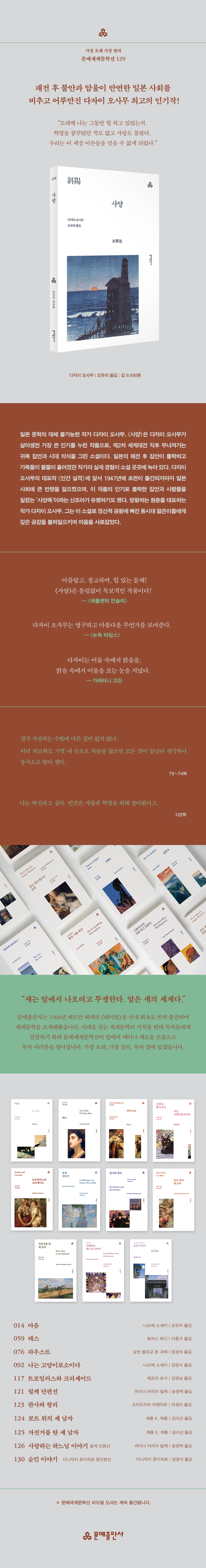ÀϺ» ¹®ÇÐÀÇ ´ëü ºÒ°¡´ÉÇÑ ÀÛ°¡ ´ÙÀÚÀÌ ¿À»ç¹«. ±×ÀÇ »ýÀü °¡Àå Å« Àα⸦ ´©¸° ÀÛǰ ¡¶»ç¾ç¡·Àº 2Â÷ ¼¼°è´ëÀü Á÷ÈÄ ¹«³ÊÁ®°¡´Â ±ÍÁ· Áý¾È°ú ½Ã´ë ÀǽÄÀ» ±×¸° ¼Ò¼³ÀÌ´Ù. ÀÌ ÀÛǰÀº ¡¶Àΰ£ ½Ç°Ý¡·¿¡ ¾Õ¼ 1947³â ¹®¿¹Áö ¡¶½ÅÃÊ(ãæðÍ)¡·¿¡ ¿¬ÀçµÇ¾ú°í °°Àº ÇØ Ãâ°£µÇ¾ú´Ù. ÃÊÆÇÀÌ ¼¼»ó¿¡ ³ª¿ÀÀÚ¸¶ÀÚ ¸¸¿© ºÎ ÀÌ»ó ÆÇ¸ÅµÇ¸ç º£½ºÆ®¼¿·¯·Î ÀÚ¸® Àâ¾Ò´Ù. ½ÉÁö¾î ¸ô¶ôÇÑ Áý¾È°ú »ç¶÷µéÀ» ÀÏÄ´ ¡®»ç¾çÁ·¡¯À̶ó´Â ½ÅÁ¶¾î°¡ »ý°Ü À¯ÇàÇϴ°¡ Çϸé, Áö±ÝÀº ±â³ä°üÀÌ µÈ ´ÙÀÚÀÌ ¿À»ç¹«ÀÇ »ý°¡´Â ¡®»ç¾ç°ü¡¯À̶ó ºÒ·È´Ù°í ÇÏ´Ï ´ç½Ã ÀÌ ÀÛǰÀÇ Àα⸦ ÁüÀÛÇÒ ¸¸ÇÏ´Ù. ´ÙÀÚÀÌ´Â ÀϺ»ÀÇ ÆÐÀü ÈÄ Áý¾ÈÀÌ ¸ô¶ôÇÏ°í °¡Á·µéÀÌ »Ô»ÔÀÌ Èð¾îÁ³´ø ½ÇÁ¦ °æÇèÀ» ÀÌ ¼Ò¼³ °÷°÷¿¡ ³ì¿©³Â´Ù. ÀϺ»ÀÇ ¹®¿¹Æò·Ð°¡ÀÌÀÚ ´ÙÀÚÀÌ ¿À»ç¹« ¿¬±¸ÀÇ ±ÇÀ§ÀÚÀÎ ¿ÀÄí³ë ´ÙÄÉ¿À´Â ¡°¡¶»ç¾ç¡·Àº »ç¶û°ú Çõ¸í¿¡ »ç´Â »õ·Î¿î Àΰ£»ó°ú »õ·Î¿î »îÀÇ ¹æ½ÄÀ» ¸ð»öÇÑ ÀÛǰ¡±À̶ó¸ç ¡°´ÙÀÚÀÌÀÇ »ý»ýÇÑ ¹¦»ç¿Í õÀçÀû ÇÊ·ÂÀº µ¶ÀÚµéÀÇ ¿µÈ¥À» ¿ÏÀüÈ÷ »ç·ÎÀâ´Â´Ù¡±¶ó°í »óÂùÇß´Ù. ¹æÈ²Çϴ ûÃáÀ» ´ëÇ¥ÇÏ´Â ÀÛ°¡ ´ÙÀÚÀÌ ¿À»ç¹«. ±×°¡ Àڱ⠰æÇèÀ» ¹Ý¿µÇØ Àΰ£ ¼¼»óÀÇ ºÎÁ¶¸®¸¦ ÇâÇÑ ¹Ý°¨°ú Àΰ£ Á¸ÀçÀÇ º»Áú¿¡ °üÇÑ °í³ú¸¦ ¼ÖÁ÷ÇÏ°Ô Ç®¾î³½ ÀÌ ¼Ò¼³Àº µ¿½Ã´ë ÀþÀºÀ̵鿡°Ô ±íÀº °ø°¨À» ºÒ·¯ÀÏÀ¸Å°°í ¸¶À½À» »ç·ÎÀâ¾Ò´Ù.