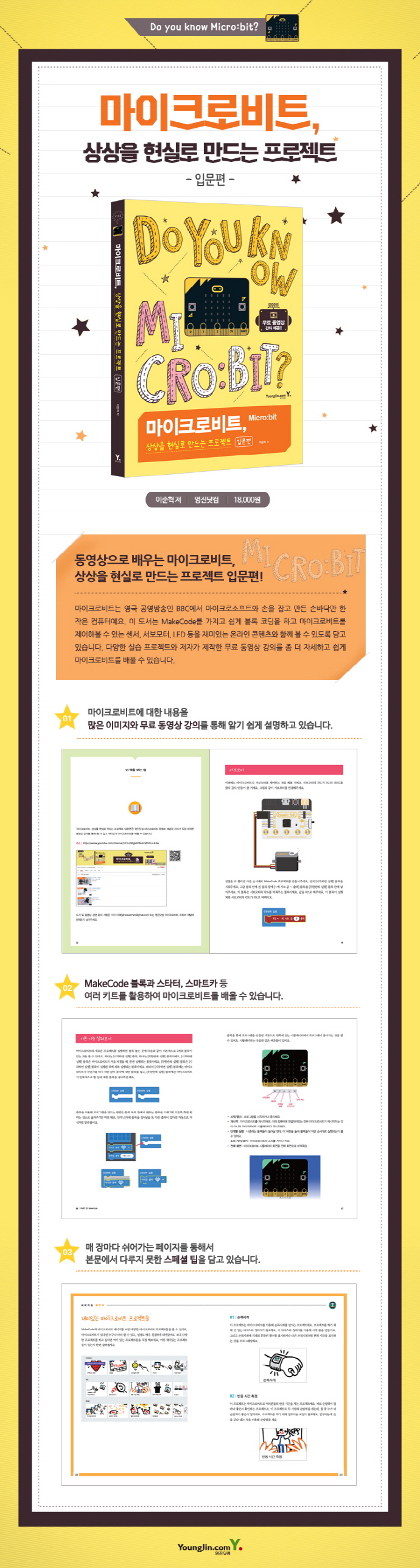 ÀÌ µµ¼´Â ¸¶ÀÌÅ©·ÎºñÆ®¸¦ óÀ½ Á¢ÇÏ´Â Ãʺ¸ÀÚµéÀÌ ½±°Ô ¹è¿ï ¼ö ÀÖµµ·Ï ±¸¼ºÇϰí ÀÖ½À´Ï´Ù. ±âº»ÀûÀÎ ¸¶ÀÌÅ©·ÎºñÆ®¿¡ ´ëÇÑ ¼Ò°³¿Í ÇÁ·Î±×·¡¹ÖÇÒ ¶§ »ç¿ëÇÏ´Â MakeCode¸¦ ¼³¸íÇϰí, ±âº»ÀûÀÎ ºÎǰ°ú ¿¬°áÇÏ¿© »ç¿ëÇÏ´Â ¹æ¹ýÀ» ¾Ë·ÁÁÝ´Ï´Ù. ¶ÇÇÑ, Ä¿³ØÅÍ·Î ÀüÀÚ ºÎǰ ¿¬°áÀÌ ½¬¿î º£ÀÌÁ÷ ŰƮ¸¦ ÀÌ¿ëÇÏ¿© ÇÇÁöÄà ÄÄÇ»ÆÃÀ» ÇØº¸°Å³ª, ½ºÅ¸ÅÍ Å°Æ®¸¦ ÀÌ¿ëÇÏ¿© LED, ¹öư, ½ºÇÇÄ¿ µî ¿©·¯ µ¿ÀÛÀ» Á¦¾îÇØº¾´Ï´Ù. ¸¶Áö¸·À¸·Î ½º¸¶Æ®Ä« ŰƮ¸¦ ÀÌ¿ëÇÏ¿© ½º¸¶Æ®Ä« ¸öü¿Í ÄÁÆ®·Ñ·¯¸¦ ¸¸µå´Â µî ¿©·¯ ÇÁ·ÎÁ§Æ® ¿¹Á¦¿Í ÀúÀÚ°¡ Á÷Á¢ Á¦ÀÛÇÑ ¹«·á µ¿¿µ»ó °ÀǸ¦ ÅëÇØ Á» ´õ ¾Ë±â ½±°Ô ¸¶ÀÌÅ©·ÎºñÆ®¸¦ ¹è¿ï ¼ö ÀÖ½À´Ï´Ù.