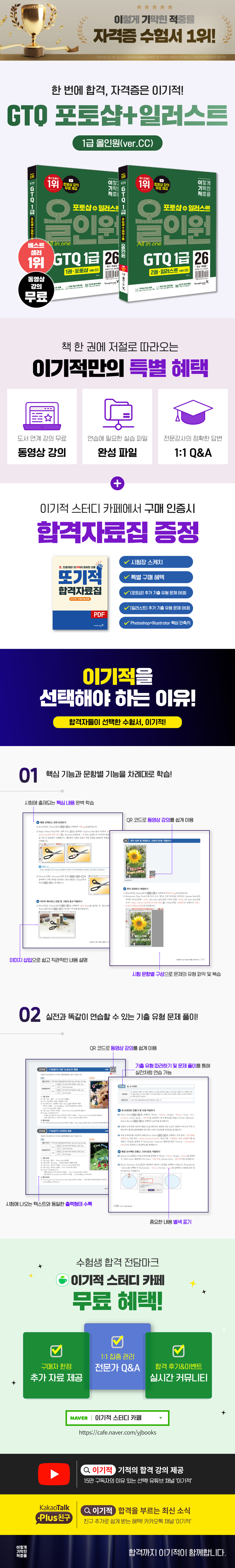 Ã¥¼Ò°³Æ÷Åä¼¥+ÀÏ·¯½ºÆ® 1±Þ ½ÃÇèÀ» µ¿½Ã¿¡ ÁغñÇÏ´Â ¸ðµç »ç¶÷µé¿¡°Ô ÇÊ¿äÇÑ [À̱âÀû GTQ Æ÷Åä¼¥+ÀÏ·¯½ºÆ® 1±Þ ¿ÃÀοø(ver.CC)] µµ¼°¡ Ãâ°£µÇ¾ú½À´Ï´Ù. ¿ÃÀοøÀ» ÅëÇØ °³³äÀ» Á¤¸®ÇÏ°í ±âÃâ À¯Çü ¹®Á¦¸¦ ÅëÇØ ÇÑ ¹ø¿¡ ÇÕ°ÝÇϼ¼¿ä! Æ÷Åä¼¥°ú ÀÏ·¯½ºÆ®¸¦ óÀ½ Á¢Çغ¸´Â ºÐµéÀ» À§ÇØ ÇÁ·Î±×·¥¿¡ ´ëÇÑ ¼³¸í°ú ÅøÀ» ÀÍÈú ¼ö ÀÖµµ·Ï ÇÙ½É ±â´ÉÀ» ¼³¸íÇÕ´Ï´Ù. ¶ÇÇÑ ½ÇÁ¦ ½ÃÇèÀÇ ¹®Ç׺°·Î ³ª¿À´Â ±â´ÉÀ» µû¶ó ÀÍÈú ¼ö ÀÖµµ·Ï ÀÚ¼¼ÇÑ ¼³¸íÀ» ÁøÇàÇÏ¿´½À´Ï´Ù. ¸¶Áö¸·À¸·Î µµ¼¿¡ ±âÀçµÇ¾î ÀÖ´Â ±âÃâ À¯Çü ¹®Á¦ °¢ 5ȸºÐÀ» Çϳª¾¿ Ç®¾îº½À¸·Î½á ½ÇÁ¦ ½ÃÇè¿¡ ÃæºÐÈ÷ ´ëºñÇÒ ¼ö ÀÖµµ·Ï ÁغñÇÏ¿´½À´Ï´Ù. ¹®Á¦ÀÇ °æ¿ì, ¡´À̱âÀû ½ºÅ͵ð Ä«Æä¡µ¿¡¼ ±¸¸Å ÀÎÁõÀ» ÁøÇà ½Ã, °¢ ÀÚ°ÝÁõ¸¶´Ù Ãß°¡ ±âÃâ À¯Çü ¹®Á¦ 1ȸºÐ ¹× ´ÜÃàŰ ¸ðÀ½ÀÌ µé¾îÀÖ´Â ¶Ç±âÀû ÇÕ°ÝÀÚ·áÁýÀ» Ãß°¡·Î ¹Þ¾Æº¸½Ç ¼ö ÀÖ½À´Ï´Ù. ¶ÇÇÑ ½ÃÇè¿¡ ÇÕ°ÝÇÒ ¶§±îÁö ȨÆäÀÌÁö¿Í À¯Æ©ºê¸¦ ÅëÇØ ÀúÀÚ°¡ Á÷Á¢ °ÀÇÇÏ´Â ¹«·á µ¿¿µ»ó °Á±îÁö ¸ðµÎ Á¦°ø¹ÞÀ» ¼ö ÀÖ½À´Ï´Ù. À̱âÀûÀº ¿©·¯ºÐÀÇ ÇÕ°ÝÀ» ÀÀ¿øÇÕ´Ï´Ù!