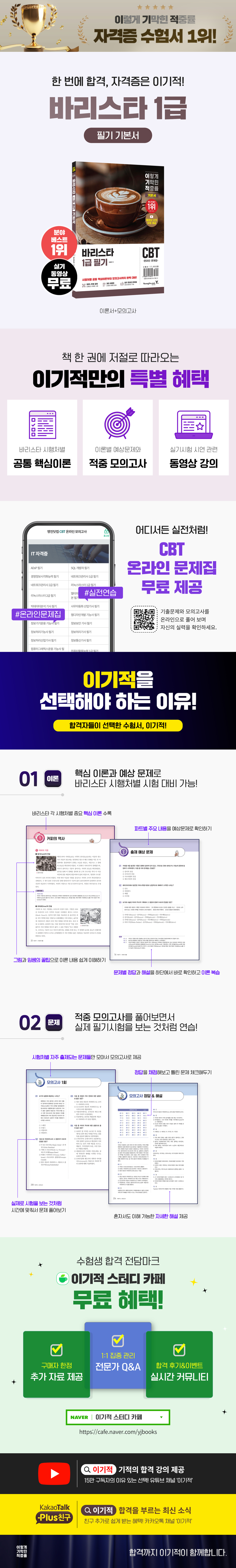 À̱âÀû ¹Ù¸®½ºÅ¸ 1±Þ Çʱ⠱⺻¼ µµ¼´Â Ä¿ÇÇ¿¡ ´ëÇØ óÀ½ºÎÅÍ °øºÎÇϽô ºÐµéÀ» À§ÇØ ÃÖ´ëÇÑ ±âÃʺÎÅÍ »ó¼¼ÇÑ ÀÌ·ÐÀ» ´ã¾Ò°í È¥ÀÚ¼ °øºÎÇÏ´õ¶óµµ ÃæºÐÇϵµ·Ï ½±°Ô Ç®¾î ³»¾ú½À´Ï´Ù. ¹«¾ùº¸´Ù ¾î¶² ½ÃÇàó¿¡¼ ½ÃÇèÀ» º¸´õ¶óµµ ¿Ïº®È÷ ´ëºñ °¡´ÉÇϵµ·Ï ¸ðµç ½ÃÇàó¸¦ ºÐ¼®ÇØ ½ÃÇè¿¡ ³ª¿À´Â ÀÌ·ÐÀ» ²Ä²ÄÈ÷ ´ã¾Ò½À´Ï´Ù. À̱âÀû°ú ÇÔ²² ¹Ù¸®½ºÅ¸ ÀÚ°ÝÁõÀ» ÃëµæÇϼ¼¿ä.
