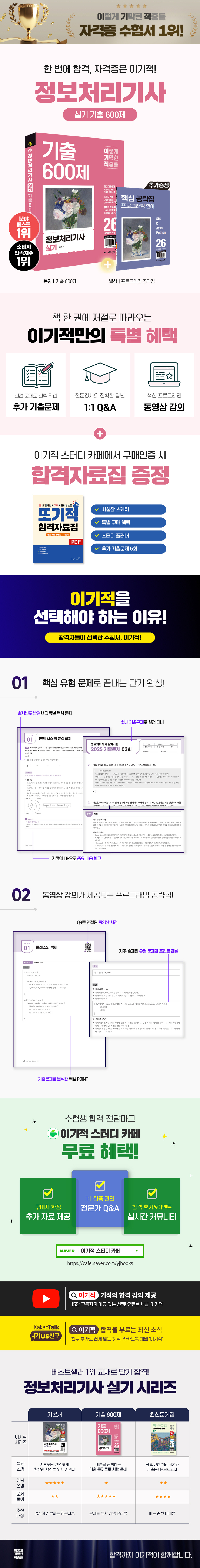 º» µµ¼´Â Á¤º¸Ã³¸®±â»ç ½Ç±â ½ÃÇèÀÇ ÃֽŠÃâÁ¦°æÇâÀ» ºÐ¼®ÇÏ¿© Àû¿ëÇÑ µµ¼·Î, ¹®Á¦¸¦ ¸¹ÀÌ Ç®¾îº¸°í ½ÍÀº ¼öÇè»ýµéÀÌ È¥ÀÚ¼µµ ÇнÀÇÒ ¼ö ÀÖµµ·Ï ÇÑ ¿Ïº® ´ëºñ¼ÀÌ´Ù. ½ÃÇàóÀÎ »ê¾÷Àη°ø´Ü¿¡¼ °ø°³ÇÑ ÃâÁ¦±âÁØÀ» ¹ÙÅÁÀ¸·Î ÁýÇʵǾúÀ¸¸ç, ±âÃÊ ÀÌ·ÐÀ» ´ãÀº Çٽɹ®Á¦¸¦ ¼øÂ÷ÀûÀ¸·Î °øºÎÇÏ¸ç ½ÃÇèÀ¯Çü°ú ºÎÁ·ÇÑ ºÎºÐÀ» üũÇϰí, ±âÃâ º¹¿ø ¹®Á¦·Î ½ÃÇèÀå¿¡ µé¾î°¡±â Àü±îÁö ÇÕ°ÝÀ» À§ÇÑ Á¡°ËÀ» ÇÒ ¼ö ÀÖµµ·Ï ±¸¼ºÇÏ¿´´Ù. ¶ÇÇÑ º°Ã¥À¸·Î Á¦°øµÇ´Â SQL, C, Java, Python °ø·«ÁýÀº ºñÁßÀÌ Å« ÇÁ·Î±×·¡¹Ö °ú¸ñÀ» µ¿¿µ»ó °ÀÇ¿Í ÇÔ²² °øºÎÇÒ ¼ö ÀÖµµ·Ï Áö¿øÇÏ¿© ´õ¿í öÀúÇÑ ½ÃÇè ´ëºñ¸¦ µ½´Â´Ù.