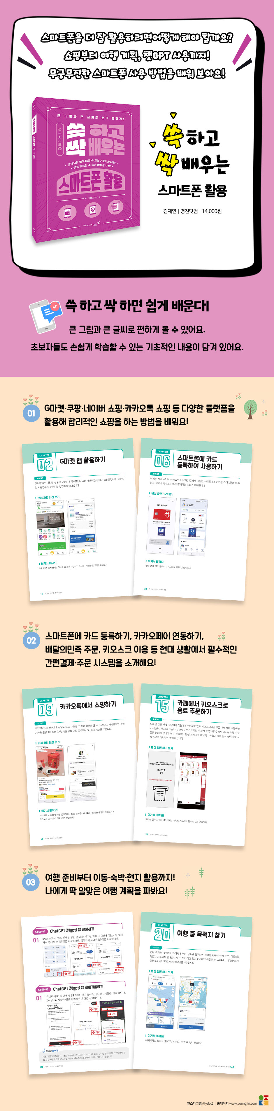 ¿Â¶óÀÎ ¼îÇκÎÅÍ °£Æí°áÁ¦, Áß°í°Å·¡, ¹è´Þ¾Û ÁÖ¹®, ±×¸®°í ¿©Çà Áغñ±îÁö ½º¸¶Æ®Æù Çϳª·Î ÇØ°áÇØ¾ß ÇÏ´Â ´Ù¾çÇÑ »ýȰ °úÁ¤µéÀ» ´Ü°èº°·Î ¼³¸íÇÕ´Ï´Ù. ÀÌ Ã¥Àº Å« ±×¸²°ú Å« ±Û¾¾, ±×¸®°í Àç¹ÌÀÖ´Â ½Ç½À ¿¹Á¦¸¦ ÅëÇØ ½º¸¶Æ®ÆùÀÇ ´Ù¾çÇÑ ¾ÛÀ» ¹è¿ï ¼ö ÀÖµµ·Ï ±¸¼ºµÇ¾î ÀÖ½À´Ï´Ù.