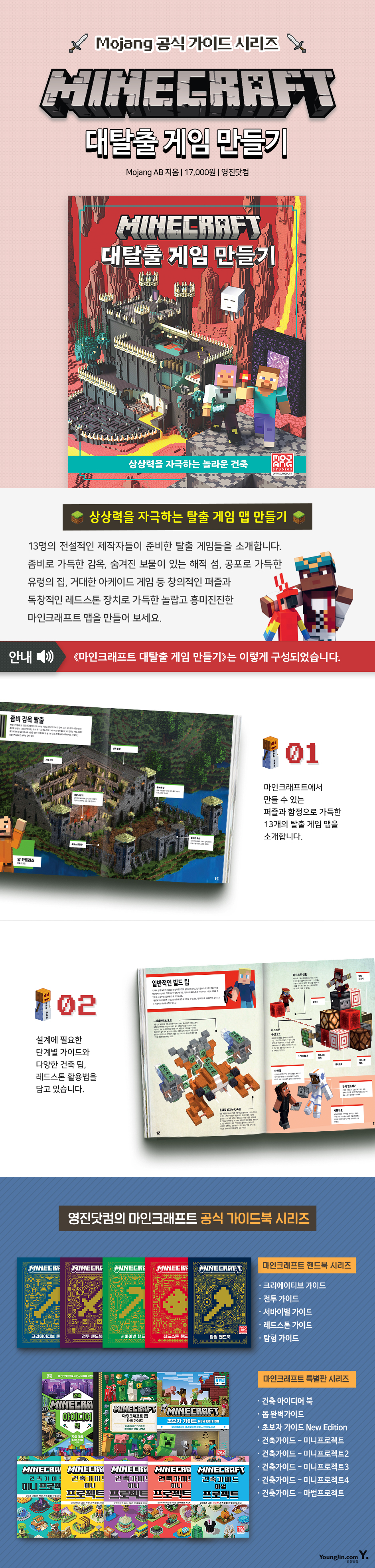 ¸¶ÀÎÅ©·¡ÇÁÆ®¿¡¼ Á÷Á¢ Á¦ÀÛÇϰí Áñ±æ ¼ö ÀÖ´Â, ÆÛÁñ°ú ÇÔÁ¤À¸·Î °¡µæÇÑ 13°¡Áö Å»Ãâ °ÔÀÓ ¸ÊÀ» ¼Ò°³ÇÕ´Ï´Ù. Á»ºñ°¡ µæ½Ç°Å¸®´Â °¨¿Á, º¸¹°ÀÌ ¼û°ÜÁø ÇØÀû ¼¶, ¿À½ÏÇÑ À¯·ÉÀÇ Áý, ±×¸®°í °Å´ëÇÑ ¾ÆÄÉÀÌµå °ÔÀÓ±îÁö! Ãʺ¸ÀÚ¸¦ À§ÇÑ Àç¹ÌÀÖ´Â µµÀüºÎÅÍ °í³µµ ¸Ê µðÀÚÀαîÁö ´Ù¾çÇÑ ³À̵µÀÇ °ÇÃà ÇÁ·ÎÁ§Æ®¸¦ ¼ö·ÏÇß½À´Ï´Ù. °¢ ÇÁ·ÎÁ§Æ®´Â ¿Ï¼ºµÈ ¸ð½À°ú ÇÙ½É ¼¼ºÎ »çÇ×Àº ¹°·Ð, Á¦ÀÛ¿¡ ÇÊ¿äÇÑ ´Ü°èº° °¡À̵å¿Í ½Ç¹« °ÇÃà ÆÁ, ·¹µå½ºÅæ Ȱ¿ë¹ýÀ» Ä£ÀýÇÏ°Ô ¾È³»ÇÕ´Ï´Ù. ÀÌ Ã¥Àº ´Ü¼øÈ÷ µû¶ó ÇÏ´Â ¼öÁØÀ» ³Ñ¾î, ¿©·¯ºÐÀÌ Á÷Á¢ º¹ÀâÇÑ ½Ã½ºÅÛÀ» ¼³°èÇÒ ¼ö ÀÖµµ·Ï âÀÇÀûÀÎ ¿µ°¨À» Á¦°øÇÕ´Ï´Ù. Àü¹®°¡µéÀÇ ³ëÇÏ¿ì¿Í ¼÷·ÃµÈ °ÇÃà ±â¼úÀ» ÀÍÇô Ä£±¸µéÀ» ³î¶ó°Ô ÇÒ Á¤±³ÇÑ Å»Ãâ ¸ÊÀ» ¿Ï¼ºÇϰí, ¸¶ÀÎÅ©·¡ÇÁÆ® ÃÖ°íÀÇ °ÇÃà°¡·Î °Åµì³ª º¸¼¼¿ä.