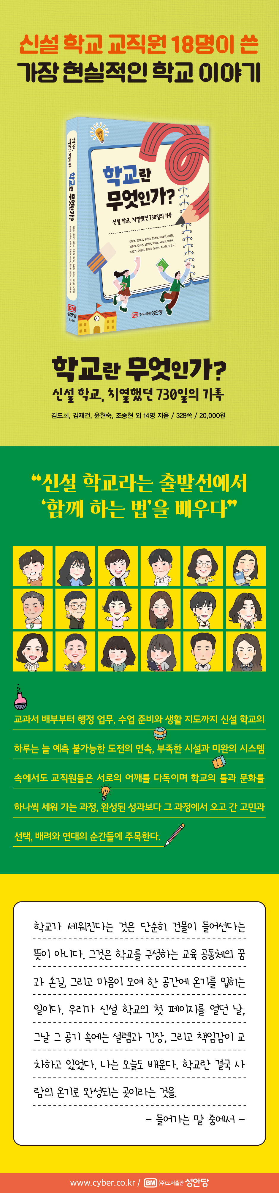 ÀÌ Ã¥Àº °®ÃçÁöÁö ¾ÊÀº ÀÚ¸®¿¡¼ ½Å¼³ Çб³¸¦ ÇÔ²² ¸¸µé¾î °£ 18¸íÀÇ ±³Á÷¿øÀÌ ³²±ä ±â·ÏÀÌ´Ù. ±³°ú¼ ¹èºÎºÎÅÍ ÇàÁ¤ ¾÷¹«, ¼ö¾÷ Áغñ¿Í »ýȰ Áöµµ±îÁö ½Å¼³ Çб³ÀÇ ÇÏ·ç´Â ´Ã ¿¹Ãø ºÒ°¡´ÉÇÑ µµÀüÀÇ ¿¬¼ÓÀ̾ú´Ù. ºÎÁ·ÇÑ ½Ã¼³°ú ¹Ì¿ÏÀÇ ½Ã½ºÅÛ ¼Ó¿¡¼µµ ±³Á÷¿øµéÀº ¼·ÎÀÇ ¾î±ú¸¦ ´Ùµ¶À̸ç Çб³ÀÇ Æ²°ú ¹®È¸¦ Çϳª¾¿ ¼¼¿ö °¬´Ù. ÀÌ Ã¥Àº ¿Ï¼ºµÈ ¼º°úº¸´Ù ±× °úÁ¤¿¡¼ ¿À°í °£ °í¹Î°ú ¼±ÅÃ, ¹è·Á¿Í ¿¬´ëÀÇ ¼ø°£µé¿¡ ÁÖ¸ñÇÑ´Ù. ¸Å´º¾ó¿¡´Â ´ã±âÁö ¾Ê´Â ½Å¼³ Çб³ ÇöÀåÀÇ ÁøÂ¥ À̾߱â, ±×¸®°í ¡®Çб³¶õ ¹«¾ùÀΰ¡¡¯¶ó´Â Áú¹®¿¡ ´ëÇÑ 18°³ÀÇ ¼ÖÁ÷ÇÑ ´äÀÌ ÀÌ ÇÑ ±Ç¿¡ ´ã°Ü ÀÖ´Ù. ÀÌ ±â·ÏÀÌ ½Å¼³ Çб³¶ó´Â Ư¼öÇÑ »ç·Ê¸¦ ³Ñ¾î, Çб³¸¦ ÇÔ²² ¸¸µé¾î °¡´Â ¸ðµç À̵鿡°Ô ÀÛÀº ÀÌÁ¤Ç¥°¡ µÇ±â¸¦ ¹Ù¶õ´Ù. ¶ÇÇÑ ±³»ç¿Í ÇлýÀÌ ¸ðµÎ°¡ ÇÔ²² ¼ºÀåÇÏ´Â »õ·Î¿î °æÇèÀ¸·Î À̾îÁö±â¸¦ ¹Ù¶õ´Ù.