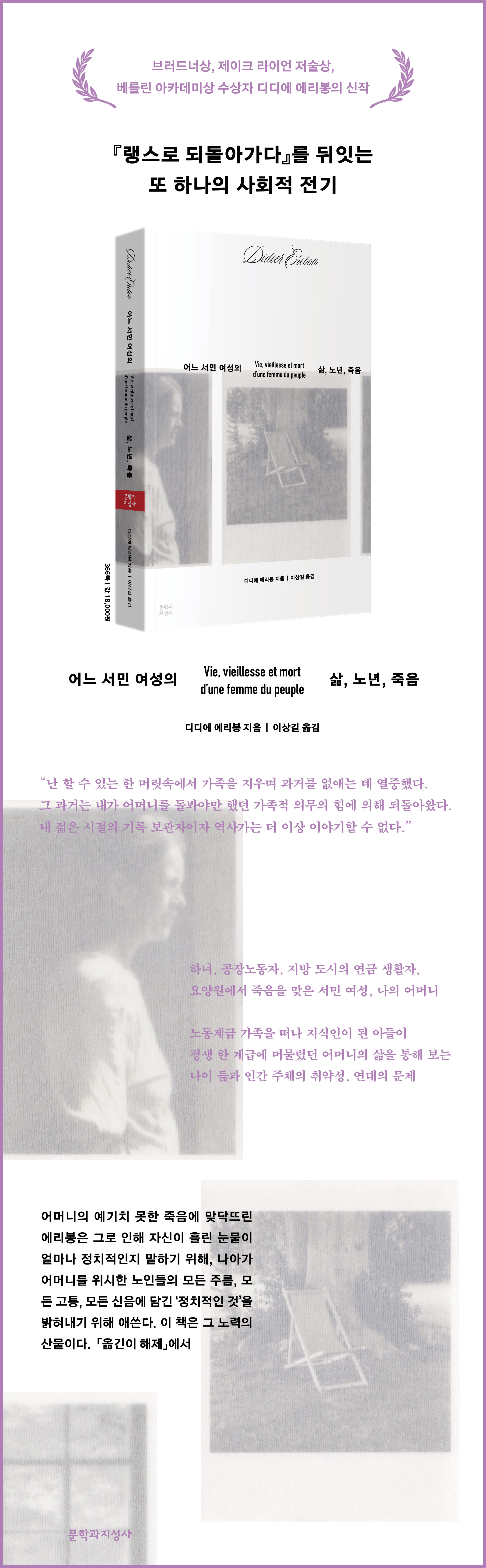 ¡º¾î´À ¼¹Î ¿©¼ºÀÇ »î, ³ë³â, Á×À½¡»¿¡¼ ÀúÀÚ´Â Æò»ý ³ëµ¿°è±ÞÀÇ ÀÏ¿øÀ¸·Î ¸Ó¹°·¶´ø ¾î¸Ó´ÏÀÇ »îÀ» ¼úȸÇÑ´Ù. ƯÈ÷ °©ÀÛ½º·¯¿î °Ç° ¾ÇÈ·Î ¿ä¾ç¿ø¿¡ ÀÔ¼ÒÇÑ µÚ µÎ ´Þµµ ä Áö³ªÁö ¾Ê¾Æ ¸Â°Ô µÈ ¾î¸Ó´ÏÀÇ Á×À½Àº ¿¡¸®ºÀ¿¡°Ô ³ë³â°ú Ãë¾àÇÑ ÁÖü, µ¹º½°ú ¿¬´ëÀÇ ¹®Á¦¸¦ ¼ºÂûÇÏ´Â °è±â°¡ µÈ´Ù. À̶§ ÀúÀÚ°¡ ¸¶ÁÖÇÑ °ÍÀº Àΰ£À¸·Î¼ ÇÇÇØ°¥ ¼ö ¾ø´Â Áúº´°ú °íÅë¹Þ´Â ¸ö, ³ëÈ¿Í ÀÚÀ²¼ºÀÇ »ó½Ç, ¿¾ÇÇÑ °ø°ø º¸°Ç°ú ¿ä¾ç¿øÀÇ Çö½Ç, ¡®¾î¶»°Ô Á×À» °ÍÀΰ¡¡¯¿¡ ´ëÇÑ °í¹Î °°Àº ¹®Á¦µéÀÌ´Ù. Çϳª°°ÀÌ ¹«°ÌÁö¸¸, ±×·¸´Ù°í ¸¶³É ¿Ü¸éÇϱ⠾î·Á¿î ÀÌ ¹®Á¦µéÀ» ¿¡¸®ºÀÀº Àڱ⠾î¸Ó´Ï¿Í ÀÚ½ÅÀÇ Ã¼ÇèÀ» Åä´ë·Î ¿©·¯ Ã¥°ú ¿µÈ ÅØ½ºÆ® µîÀ» ÂüÁ¶Çذ¡¸ç ÁøÁßÇÏ°Ô ³íÀÇÇÑ´Ù. Àڱ⠾î¸Ó´Ï¿¡ °üÇÑ °³ÀÎÀûÀΠȸ°í´ã¿¡¼ Ãâ¹ßÇϸé¼, ÀúÀÚ´Â ¡®ÇÁ¶û½º ³ëµ¿°è±Þ ¿©¼ºÀÇ ÀüÇüÀû ÀÏ»ý¡¯¿¡ °üÇÑ »çȸÇÐÀû ³íÀǸ¦ °ÅÃÄ ´Ù½Ã ¡®³ë³â¡¯°ú ¡®³ëÀΡ¯À̶ó´Â »çȸÀû ¹üÁÖ, ³ª¾Æ°¡ ´ÄÀ½°ú Àå¾Ö¸¦ ¼÷¸íÀûÀ¸·Î °Þ´Â Àΰ£ ÁÖüÀÇ Ãë¾à¼º°ú ¿¬´ë¿¡ °üÇÑ ÀÌ·ÐÀû ¼ºÂû·Î À̾߱⸦ È®ÀåÇØ°£´Ù.