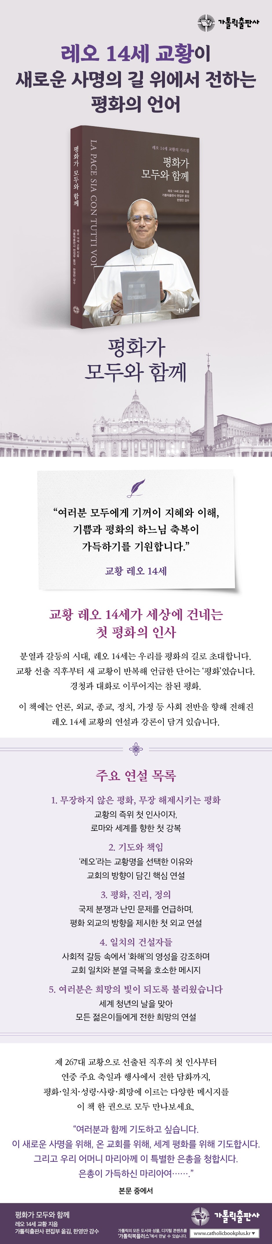 ¡¶ÆòȰ¡ ¸ðµÎ¿Í ÇÔ²²¡·´Â ÀÌ·¯ÇÑ ±³È²ÀÇ Ãʱ⠸޽ÃÁö¸¦ ÇÑ ±ÇÀ¸·Î ¹¾î »õ ½Ã´ëÀÇ Ãâ¹ßÁ¡À» µ¶ÀÚ°¡ Á÷Á¢ È®ÀÎÇÒ ¼ö ÀÖµµ·Ï ±¸¼ºÇÑ Ã¥ÀÌ´Ù. Àü ¼¼°è¸¦ ÇâÇÑ ´çºÎ´Â ¹°·Ð °¢±¹ ÁöµµÀÚ¿¡°Ô º¸³»´Â È£¼Ò, ÁÖ±³´Ü°ú Ãß±â°æ´ÜÀ» ÇâÇÑ Ã˱¸, »õ »çÁ¦µéÀ» ÇâÇÑ ±Ç°í, ÀþÀºÀ̵鿡°Ô ÀüÇÏ´Â °Ý·Á µî Æø³ÐÀº ´ë»ó¿¡°Ô °Ç³×´Â ¸Þ½ÃÁö°¡ ´ã°Ü ÀÖ´Ù. ûÁßÀº ´Ù¸£Áö¸¸ ±× ¾È¿¡ ´ã±ä ÇÙ½É °¡Ä¡´Â ÀϰüÀûÀÌ´Ù. ¹Ù·Î Àΰ£ Á¸¾öÀÇ È¸º¹, Æòȸ¦ À§ÇÑ ½ÇÁúÀû Çൿ, °øµ¿Ã¼ÀÇ ÀÏÄ¡¸¦ À§ÇÑ °æÃ», °¡Àå ¾àÇÑ À̵é°úÀÇ ¿¬´ëÀÌ´Ù.