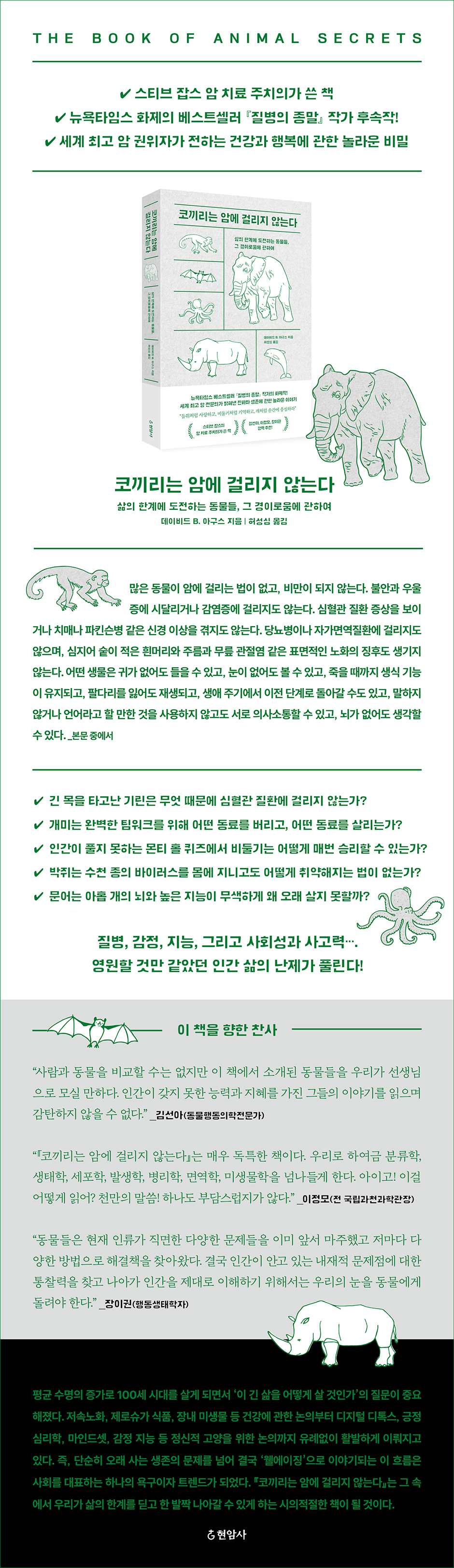 µ¥À̺ñµå B. ¾Æ±¸½º´Â ¹Ì±¹ ¾ÏÇÐȸ ¿¬±¸ ÀÇ»ç»ó, ½½·Î¾È-ÄÉÅ͸µ ¿¬±¸¼Ò ÀÓ»ó ÀÇÇÐÀÚ»ó, ±¹Á¦ °ñ¼öÁ¾Àç´Ü ºñÀü°úÇлó µîÀ» ¼ö»óÇÑ ¼¼°è ÃÖ°í ¾Ï ±ÇÀ§ÀÚÀÌÀÚ °úÇÐÀڷμ Æò»ýÀ» Àηù »îÀÇ Áú ÁõÁøÀ» À§ÇÑ ¿¬±¸¸¦ ÇØ¿Ô´Ù. ÀÌ Ã¥¿¡¼´Â Áö³ ¿¬±¸µéÀ» Åä´ë·Î ¿©ÀüÈ÷ ÇѰ谡 ºÐ¸íÇÑ Àΰ£ÀÇ ¹®Á¦µéÀ» ޱ¸Çϸç, ±× ÇØ´äÀ» ÀÚ¿¬ÀÇ µ¿¹°µéÀ» ÅëÇØ ÆîÃijõ´Â´Ù. ¡®Å»ýÀûÀ¸·Î ±ä ¸ñÀ» Ÿ°í³ ±â¸°Àº ¹«¾ù ¶§¹®¿¡ ½ÉÇ÷°ü Áúȯ¿¡¼ ÀÚÀ¯·Î¿ï ¼ö ÀÖ´ÂÁö¡¯, ¡®°³¹Ì´Â ¿Ïº®ÇÑ ÆÀ¿öÅ©¸¦ À§ÇØ ¾î¶² µ¿·á¸¦ Á×°Ô ³»¹ö·ÁµÎ°í, ¾î¶² µ¿·á¸¦ »ì¸®´ÂÁö¡¯, ¡®Àΰ£ÀÌ Ç®Áö ¸øÇÑ ¸óƼ Ȧ ÄûÁî¿¡¼ ºñµÑ±â´Â ¾î¶»°Ô ¸Å¹ø ½Â¸®ÇÒ ¼ö ÀÖ´ÂÁö¡¯, ±×¸®°í ¡®ÄÚ³¢¸®´Â Á¤¸» ¾Ï¿¡ °É¸®Áö ¾Ê´Â °ÍÀÎÁö¡¯, ÁøÈ»ý¹°ÇÐÀº ¹°·Ð ¼¼Æ÷ÇÐ, ¹ß»ýÇÐ, ¹Ì»ý¹°ÇÐ ºÐ¾ß¸¦ ³Ñ³ªµé¸ç ¿ì¸®°¡ ±×µé¿¡°Ô¼ ¹è¿ï ¼ö ÀÖ´Â ½ÅüÀû, »çȸÀû ½Ã½ºÅÛ¿¡ °üÇØ ¹æ´ëÇϸ鼵µ ü°èÀûÀÎ ¹æ½ÄÀ¸·Î À̾߱âÇÑ´Ù. ÀÌ °úÁ¤¿¡¼ Áß¿äÇÏ°Ô ´Ù·ïÁö´Â È£¸£¸ó, À¯ÀüÀÚ, DNA Á¤º¸, ¸¶ÀÌÅ©·Î¹ÙÀÌ¿È µîÀÇ ÀÛµ¿ ¿ø¸®¸¦ ÅëÇØ »ý¸í°úÇÐÀÇ ½Åºñ¸¦ ´À³¥ ¼ö ÀÖ´Ù. T¼¼Æ÷ ¸é¿ªÇÐ ¿¬±¸»ýÀ̾úÀ» ¶§ºÎÅÍ Àǰú´ëÇÐ ±³¼ö¸¦ °ÅÃÄ ÇöÀç ¾Ï Ä¡·á Àü¹®¿¬±¸¼ÒÀÇ Ã¢¸³ÀÚ·Î ÀÖ±â±îÁö µ¥À̺ñµå B. ¾Æ±¸½º°¡ ¸¸³ ´Ù¾çÇÑ »ç¶÷µé°úÀÇ ÀÏÈ´Â ÀÌ Ã¥¿¡ ±íÀÌ¿Í Àü¹®¼ºÀ» ´õÇØÁØ´Ù.
