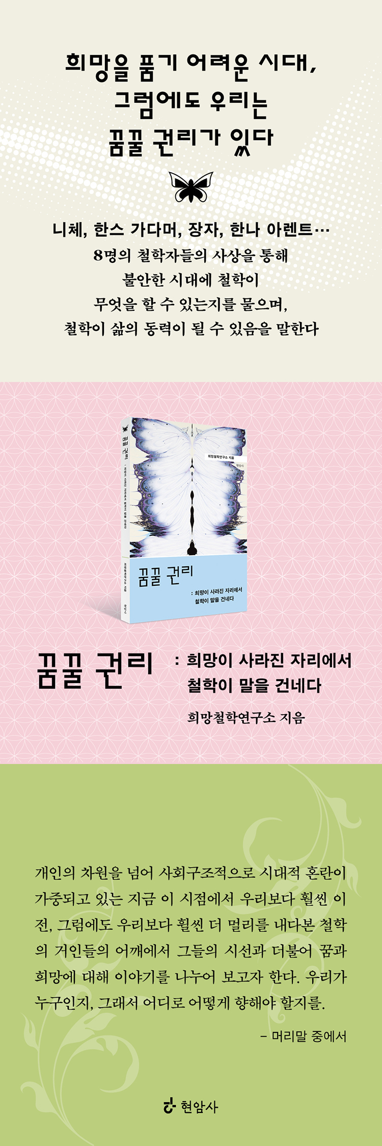 ¶ÇÇÑ ÃÖ±Ù µé¾î ³ªÅ¸³ Àç³, Áúº´, »çȸÀû À§±â¿Í °°Àº ±ØÇÑÀÇ »óȲ ¼Ó¿¡¼ Àΰ£ÀÌ ¹«¾ù¿¡ ÀÇÁöÇØ »îÀ» Áö¼ÓÇØ ¿Ô´ÂÁö¸¦ öÇÐÀûÀ¸·Î Á¶¸íÇϸç, ²ÞÀÌ ´Ü¼øÇÑ ÀÌ»óÀÌ ¾Æ´Ï¶ó »îÀ» °è¼Ó ¼±ÅÃÇÏ°Ô ¸¸µå´Â ½ÇõÀû ÈûÀÓÀ» º¸¿©ÁØ´Ù. °¢ ÀåÀº ƯÁ¤ ÀÌ·ÐÀ» ¼³¸íÇÏ´Â µ¥ ±×Ä¡Áö ¾Ê°í, ¿À´ÃÀÇ »çȸ¿Í °³ÀÎÀÇ »î¿¡ Á÷Á¢ ¿¬°áµÇ´Â Áú¹®À¸·Î ¸¶¹«¸®µÈ´Ù. À̸¦ ÅëÇØ öÇÐÀ» Áö½ÄÀÌ ¾Æ´Ñ »îÀ» ´Ù½Ã ÇØ¼®ÇÏ°í ¼±ÅÃÇÏ°Ô ÇÏ´Â »çÀ¯ÀÇ µµ±¸·Î Á¦½ÃÇÑ´Ù.