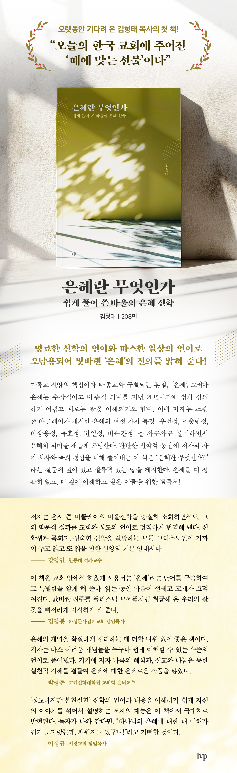 ±âµ¶±³ ½Å¾ÓÀÇ Á߽ɿ¡´Â ¾ðÁ¦³ª ÀºÇý°¡ ÀÖ¾ú´Ù. ±×·¯³ª º¹À½ÀÇ ÇÙ½É ¿ë¾îÀÎ ÀºÇý°¡ ±× ÁøÀÇ¿Í »ó°ü¾øÀÌ ¼ÒºñµÇ°í ÀÖ´Â Çö½Ç ¼Ó¿¡¼, ÀúÀÚ´Â ´Ù½Ã ¡®ÀºÇý¡¯ÀÇ ÀÚ¸®·Î ¿ì¸®¸¦ ÃÊ´ëÇÑ´Ù. À̸¦ À§ÇØ ÀúÀÚ´Â ¡®ÀºÇý¡¯¶ó´Â °³³äÀ» ¼º°æÀû¡¤½ÅÇÐÀûÀ¸·Î ÀçÁ¡°ËÇÏ¸é¼ ±× º»·¡ÀÇ Àǹ̸¦ µé·ÁÁØ´Ù. ÁÁ¾ÆÇÏÁö¸¸ Á¤È®È÷ ¾ËÁö ¸øÇß´ø ´Ü¾î, ¶§·Î´Â ¿À¿ëµÇ±â±îÁö Çß´ø ´Ü¾î¸¦ ºÙµé°í, º¹À½ÀÇ ÇÙ½ÉÀ¸·Î¼ÀÇ ÀºÇý¸¦ Â÷ºÐÈ÷ µÇ¤´Â´Ù. ´Ü¼øÇÑ Á¤¼Àû üÇèÀ̳ª Ãß»óÀû °³³äÀÌ ¾Æ´Ï¶ó, ¹Ù¿ïÀÌ ¸»ÇÑ ÀºÇýÀÇ ½ÅÇÐÀ» ÀÏ»óÀÇ ¾ð¾î·Î Ç®¾î³»·Á´Â ½Ãµµ´Ù.