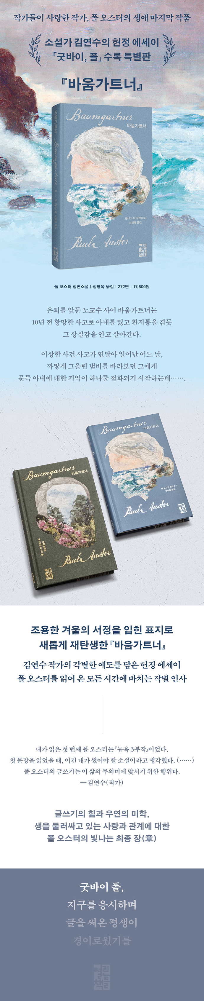 Æú ¿À½ºÅͰ¡ Åõº´ Áß ³¡À» ¿¹°¨Çϸç ÁýÇÊÇÑ »ý¾Ö ¸¶Áö¸· ÀÛǰÀÎ ÀÌ ¼Ò¼³Àº ÀºÅ𸦠¾ÕµÐ ³ë±³¼ö »çÀÌ ¹Ù¿ò°¡Æ®³Ê¸¦ ÅëÇØ »ó½Ç°ú ¾Öµµ, ±â¾ï°ú ÇöÀç, ½Ã°£ÀÇ È帧°ú »îÀÇ Àǹ̸¦ ³»¹ÐÇÑ ½Ã¼±À¸·Î ´ã¾Æ³Â´Ù. ¡º4 3 2 1¡»(¿¸°Ã¥µé, 2023) ÀÌÈÄ 6³â ¸¸¿¡ Æì³½ ÀåÆí¼Ò¼³ÀÌ¸é¼ ±×¿Í ´ëÁ¶ÀûÀ¸·Î 2¹é ¸é ³²ÁþÇÑ ÂªÀº ÀÛǰÀ¸·Î, Æú ¿À½ºÅͰ¡ Æò»ý µ¿¾È ´Ù·ï ¿Ô´ø ÁÖÁ¦ÀÎ ±Û¾²±â¿Í Ç㱸°¡ ¸¸µé¾î ³»´Â Áø½Ç°ú Èû, ±×¸®°í ¿ì¿¬ÀÇ ¹ÌÇп¡ ´ëÇÑ »çÀ¯°¡ °£°áÇÏ°í ¼¶¼¼ÇÏ°Ô Áý¾àµÈ ÀÌ ¼Ò¼³Àº ¡´ÀÌÅä·Ï ªÀº Ã¥ ÇÑ ±Ç¿¡ ¼ö¸¹Àº °ÍÀ» ´ã¾Ò´Ù¡µ´Â ¾ð·ÐÀÇ Âù»ç¿Í ´õºÒ¾î ÃʱâÀÛµéÀ» ¿¬»ó½ÃŰ¸é¼µµ »îÀÇ ¸·¹ÙÁö¿¡ À̸¥ ÀÛ°¡ÀÇ ¿ø¼÷ÇÑ »çÀ¯ ¶ÇÇÑ º¸¿© Áشٴ Æò°¡¸¦ ¹Þ¾Ò´Ù.