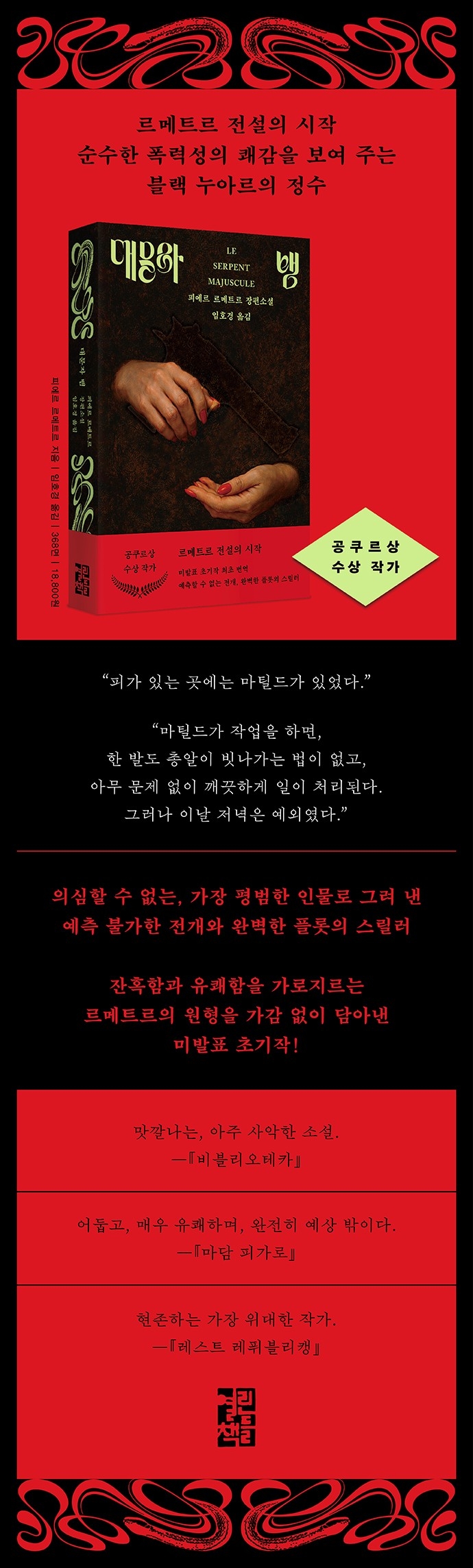 ÃßÀû°ú ¿ÀÆÇÀÌ ±³Â÷ÇÏ¸ç µ¶ÀÚÀÇ ¿¹»óÀ» °è¼ÓÇØ¼ ¹è¹ÝÇÏ´Â ¡º´ë¹®ÀÚ ¹ì¡»Àº ÅëÄèÇÑ ÀÀ¡±ØÀÌ ¾Æ´Ï´Ù.¡´´©¾Æ¸£ µ¶ÀÚµéÀÌ ÇÇ¿Í Á×À½°ú ºÒ°øÁ¤ÇÔÀ» ±â´ëÇÒ °ÍÀ̶ó È®½ÅÇÑ´Ù¡µ´Â ¸£¸ÞÆ®¸£ÀÇ ¸»Ã³·³, ÀÌ ¼Ò¼³Àº ¸À±ò³ª°íµµ »ç¾ÇÇÑ ¹æÇâÀ¸·Î À§Çèõ¸¸ÇÏ°Ô ±â¿î´Ù. ¾îµÓ°í À¯ÄèÇϸ鼵µ ¿ÏÀüÈ÷ ¿¹»ó ¹ÛÀ¸·Î »¸¾î ³ª°¡¸ç, ¼ø¼öÇÑ Æø·Â¼ºÀÌ º¸¿© ÁÖ´Â Äè°¨°ú ¾ÆÀÌ·¯´ÏÇÔÀ¸·Î Èì»¶ ºüÁ®µé°Ô ¸¸µå´Â, °¡Àå ³¯°ÍÀÇ ´©¾Æ¸£¸¦ ¸Àº¼ ¼ö ÀÖ´Ù.