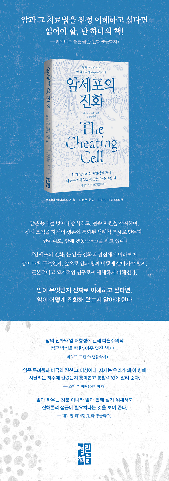 »ç¶÷Àº ¾Ï°ú ÇÔ²² ž¼ ¾Ï°ú °°ÀÌ »ì´Ù°¡ ¾Ï°ú µ¿½Ã¿¡ Á״´Ù. ±×¸®°í ¾ÏÀº ´©±¸³ª °É¸± ¼ö ÀÖ´Ù. ¡º¾Ï¼¼Æ÷ÀÇ ÁøÈ¡»´Â ¿ì¸® »îÀÇ µ¿¹ÝÀÚ°¡ µÈ ¾ÏÀ» ÁøÈÀû °üÁ¡¿¡¼ ¹Ù¶óº¸¸ç µµ´ëü ¾ÏÀÌ ¹«¾ùÀÎÁö, ¾ÕÀ¸·Î ¾Ï°ú ¾î¶»°Ô »ì¾Æ°¡¾ß ÇÒÁö¿¡ °üÇØ ¼¼¼¼ÇÏ°Ô ÆÄÇìÄ£´Ù. ¾Ï »ý¹°ÇÐÀÚÀÌÀÚ ±¹Á¦ ÁøÈ »ýÅ ¾Ï ÇÐȸ¸¦ ¼¼¿î ¾Ö¸®Á¶³ª ÁÖ¸³ ´ëÇб³ÀÇ ±³¼ö ¾ÆÅ׳ª ¾×ƼÇǽº´Â ¾Ï¿¡ ´ëÇØ ±Ùº»ÀûÀ̰í ȹ±âÀûÀ¸·Î Á¢±ÙÇÑ´Ù. Àü ¼¼°è¸¦ ÅëÆ²¾î µÎ ¹øÂ°·Î Å« »ç¸Á ¿øÀÎÀÎ ¾ÏÀº ¼ö½Ê¾ï ³â Àü ´Ù¼¼Æ÷ »ý¸íüÀÇ ±â¿øÀ¸·Î °Å½½·¯ ¿Ã¶ó°£´Ù. ¿ì¸®´Â °ÅÀÇ 10¾ï ³â¿¡ °ÉÄ£ ´Ù¼¼Æ÷üÀÇ ÁøÈ¸¦ ÅëÇØ¼ ¸¸µé¾îÁ³´Âµ¥, ±×µ¿¾È ´Ù¼¼Æ÷üÀÇ ¼¼Æ÷µéÀº Çù·ÂÇÏ´Â ¼¼Æ÷ »çȸ Àüü, Áï ´Ù¼¼Æ÷üÀÇ »ýÁ¸°ú ¹ø½ÄÀ» °ÈÇÏ´Â ¹æ½ÄÀ¸·Î ÇൿÇÏ°Ô µÇ¾ú´Ù. ¿ì¸® ü³»ÀÇ ¼¼Æ÷µéÀº ÀÚ¿øÀ» ³ª´©°í, °øÀ¯ ȯ°æÀ» º¸»ìÇǰí, ¸ö ÀüüÀÇ ÀÌÀÍÀ» À§Çؼ ±×µéÀÇ ÇൿÀ» Á¶ÀýÇÏ´Â µî À¯ÅäÇǾÆÀûÀÎ ÇൿÀ» ÇÑ´Ù.