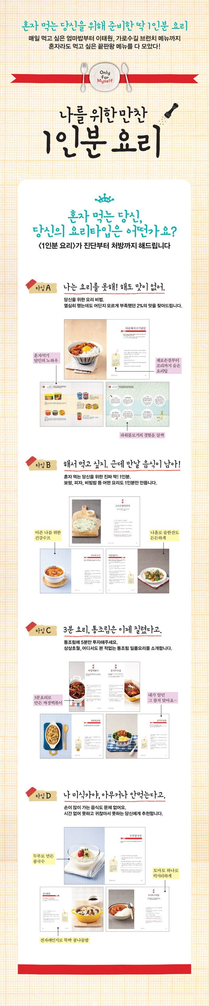 È¥ÀÚ »ç´Â »ç¶÷ÀÌ ¸¹¾ÆÁø ½Ã´ë, °¡Á·ÀÌ À־ È¥ÀÚ ¹ä ¸Ô´Â ¶§°¡ ¸¹¾ÆÁø ½Ã´ë. È¥ÀÚ¶ó´Â ÀÌÀ¯·Î, ±ÍÂú´Ù´Â ÀÌÀ¯·Î Áö±Ý ³»°Ô ÁÖ¾îÁø º¸¾à °°Àº ½Ã°£À» ´ëÃæ Èê·Á¹ö¸®±â¿£ ³Ê¹« ¾Æ±õ½À´Ï´Ù. 1ÀκÐÀÌ´Ï±î ´õ °£´ÜÇÏ°í ´õ ¸ÀÀÖ°Ô ¸¸µé ¼ö ÀÖ´Â ¹æ¹ýÀÌ ¸¹½À´Ï´Ù. ¶Ç 1ÀκÐÀ¸·Î ¸¸µé¾ú´ø ¿ä¸®¸¦ ¸î ¹è·Î ´Ã·Á¼ ÁÁÀº »ç¶÷µé°ú ÇÔ²² ³ª´©´Â Àç¹Ìµµ ½ò½òÇÕ´Ï´Ù. ±ÍÂúÀ½º¸´Ù´Â ³ª¸¦ »ç¶ûÇÏ´Â ¸¶À½À» Ű¿ö ±× ¾î¶² º¸¾àº¸´Ù ´õ ÁÁÀº ¹ä»ó¿¡¼ Å« ÈûÀ» ¹ÞÀ¸½Ã±â ¹Ù¶ø´Ï´Ù. ÃâÆÇ»ç ¼ÆòÈ¥ÀÚ ¸Ô´Â ¹ä»óµµ dz¼ºÇÏ°í ¸ÀÀÖ°Ô! ½Ì±ÛÁ·°ú ¼Ò°¡Á·À» À§ÇÑ ³²±è ¾ø´Â ½ÉÇà ·¹½ÃÇÇ. ´ëÇ¥ ¹ä¹ÝÂùºÎÅÍ Ä«Æä ºê·±Ä¡, ¼ú¾ÈÁÖ, ÅëÁ¶¸²À» ÀÌ¿ëÇÑ ÀÏǰ¿ä¸®±îÁö Ȱ¿ëµµ ³ôÀº 120ǰÀÇ ¿ä¸®¸¦ ´ã¾Ò´Ù. ÃÖ¼ÒÀÇ Àç·á¿Í °úÁ¤À¸·Î ÃÖ´ëÀÇ ¸ÀÀ» ´ã¾Æ³½ °¡Àå È¿À²ÀûÀÎ ¿ä¸®Ã¥ÀÌ´Ù.
