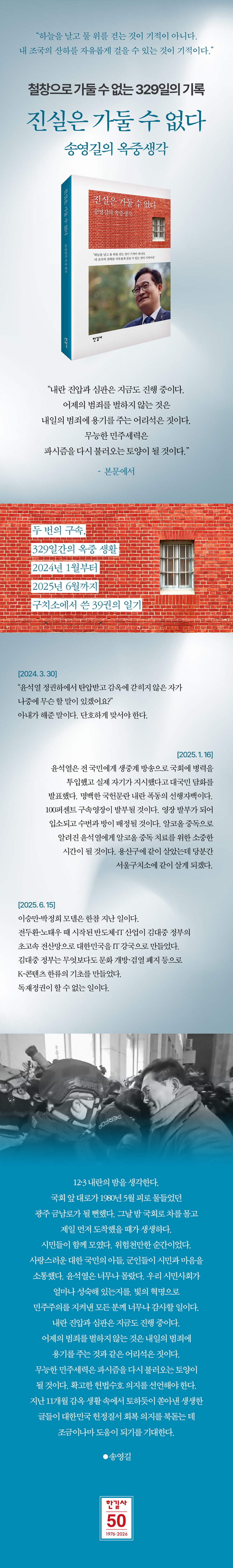 ÀÌ Ã¥Àº ¼Û¿µ±æ °³ÀÎÀÇ ¾ï¿ïÇÔÀ» È£¼ÒÇϰųª ¼ö°¨ »ýȰÀÇ °í´ÜÇÔÀ» Åä·ÎÇÏÁö ¾Ê´Â´Ù. Àü ´õºÒ¾î¹ÎÁÖ´ç ´ëÇ¥, Çö ¼Ò³ª¹«´ç ´ëÇ¥·Î¼ ´ëÇѹα¹ÀÇ ÇöÀ縦 ºñÆÇÇÏ°í ¹Ì·¡ ºñÀüÀ» Á¦½ÃÇÑ´Ù. ¶ÇÇÑ ±è°ÇÈñ ¸íǰ¹é ¼ö¼ö ³í¶õ, ä»óº´ Ư°Ë¹ý, 12¡¤3 ºñ»ó°è¾ö, źÇÙ ½ÉÆÇ µî Á¤±¹À» µÚÈçµç »ç°ÇµéÀ» »ý»ýÇÏ°Ô ±â·ÏÇØ ´ëÇѹα¹ ÇåÁ¤Áú¼ ȸº¹ ÀÇÁö¸¦ ºÏµ¸´Â µ¥ ÈûÀ» º¸ÅÄ´Ù. µ¿¿µ»ó QRÄÚµå´Â ¼Û¿µ±æÀÌ ±×°£ Ȱµ¿ÇÑ ´ëÇ¥ÀûÀÎ ±â·ÏÀ» µ¶ÀÚ¿¡°Ô Àü´ÞÇÑ´Ù. ÀçÆÇÀ» ¹ÞÀ¸¸é¼ °Þ´Â Àΰ£ÀûÀÎ °í³úºÎÅÍ ±¸Ä¡¼ÒÀÇ °íµ¶ÇÑ ¹ãÀ» °ÅÃÄ Á¤±Ç±³Ã¼ÀÇ ¼ø°£±îÁö¸¦ Áø½ÇÇÏ°Ô ´ã¾Ò´Ù.