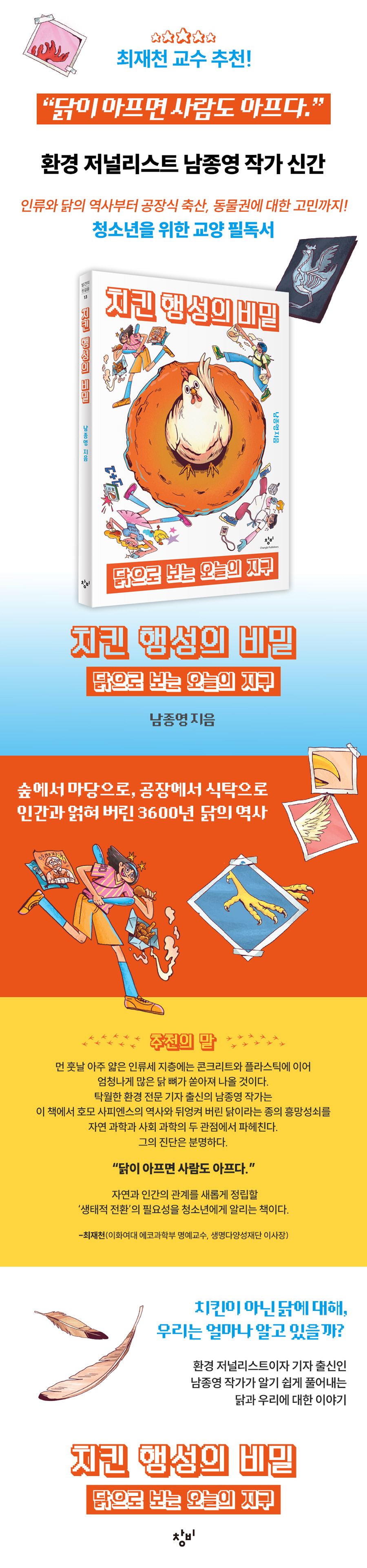³²Á¾¿µ ÀÛ°¡´Â ġŲ »óÀÚ ³Ê¸ÓÀÇ ´ß, ¾ç°èÀå ö¸Á ³Ê¸ÓÀÇ ´ß, ¼öõ ³â ¿ª»ç ³Ê¸ÓÀÇ ´ßÀ» ¼ÒȯÇÏ¸ç ¿ì¸®¿¡°Ô Àͼ÷ÇÑ ´ßÀ̶ó´Â µ¿¹°À» ³¸¼³°Ô Á¶¸íÇÑ´Ù. ¡®K-ġŲ¡¯ÀÇ ÈïÇà »ç·Ê¸¦ ½ÃÀÛÀ¸·Î ´ß°ú Àΰ£ÀÌ ¹®ÈÀûÀ¸·Î, »çȸ¡¤°æÁ¦ÀûÀ¸·Î ¾î¶»°Ô ¾ôÇô ¿Ô´ÂÁö ´Ùä·Ó°í »ý»ýÇÑ À̾߱⸦ µé·ÁÁØ´Ù. ÀÛ°¡°¡ À̲ô´Â ¡®´ß¡¯ À̾߱⿡ Ç« ºüÁ®µé¾î Ǫµå´ö ³¯°³¸¦ ÈÖÁ£´Â ±× ¿ì¾ÆÇÔ¿¡ ¸¶À½À» »ç·ÎÀâÈ÷°í ³ª¸é, ¾î´À Æ´¿¡ ¿À´Ã³¯ ¿ì¸®°¡ Ä¡¿ÇÏ°Ô °í¹ÎÇØ¾ß ÇÒ ¹®Á¦µéÀ» ¸¶ÁÖÇÏ°Ô µÈ´Ù. ÀÌ Ã¥Àº ´ßÀ» Áß½ÉÀ¸·Î Àηù¼¼, ±âÈÄ À§±â, °øÀå½Ä Ãà»ê, µ¿¹°±Ç µî ½±Áö ¾ÊÀº ÁÖÁ¦µéÀ» ¿¬°áÇØ ³»°í, û¼Ò³â ´«³ôÀÌ·Î ÀÌÇØÇϱ⠽±°Ô ¼³¸íÇÏ¸ç »ý°¢ÇÒ °Å¸®¸¦ ´øÁø´Ù. ȯ°æ À§±âÀÇ ½Ã´ë, û¼Ò³âÀ¸·Î ÇÏ¿©±Ý Àΰ£°ú µ¿¹°ÀÇ °ü°è¸¦ ´Ù½Ã °í¹ÎÇØ º¸°Ô ¸¸µå´Â Ã¥ÀÌ´Ù.