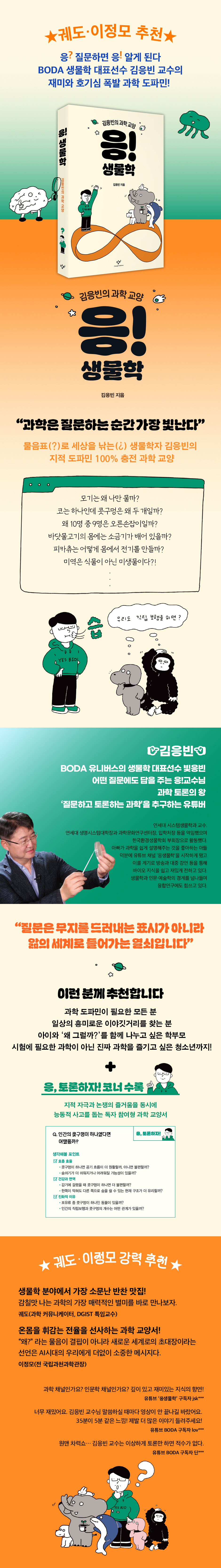 Æò¼Ò ¡®ÀÀ»ý¹°ÇС¯ ±¸µ¶ÀÚµéÀÌ ¡°°úÇРä³ÎÀΰ¡¿ä? Àι®ÇРä³ÎÀΰ¡¿ä?¡±¶ó°í ¹°À» ¸¸Å °úÇаú ¿¹¼ú, ±×¸®°í Àι®ÇÐÀ» °¡·ÎÁö¸£´Â Áö½ÄÀÇ Ç⿬À» ÆîÄ¡´Â °ÍÀÌ ±èÀÀºó ±³¼öÀÇ Àå±â´Ù. ¡®°úÇÐÀ» º¸´Ù¡¯ ä³Î¿¡¼´Â °íÁ¤°ü³ä°ú Æí°ßÀ» Çϳª¾¿ ±ú¶ß·Á°¡¸ç ÀڽŸ¸ÀÇ ´ä¿¡ µµ´ÞÇÏ´Â °úÇÐ Åä·ÐÀÇ Áø¼ö¸¦ º¸¿©ÁعÙ, ±¸µ¶ÀÚµéÀº ±×¿¡°Ô ¡®°úÇÐ Åä·ÐÀÇ ¿Õ¡¯À̶ó´Â º°¸íÀ» Áö¾îÁֱ⵵ Çß´Ù. ÀÌ Ã¥Àº ±Û¸¶´Ù µÎÅùÇÑ °úÇÐÁö½ÄÀº ¹°·Ð, ¹ø°³Ã³·³ ¸Ó¸´¼ÓÀ» ½ºÄ¡´Â ¡®¿Ö?¡¯¶ó´Â ÀüÀ²À» ´ã¾Ò´Ù. ¼ö½Ã·Î ¡®ÀÀ, Åä·ÐÇÏÀÚ!¡¯ Äڳʸ¦ ¸¶·ÃÇØ µ¶ÀÚ ½º½º·Î, ȤÀº Ä£±¸³ª AI¿Í ÇÔ²² Åä·ÐÇÏ¸ç »ç°í¸¦ È®ÀåÇÒ ¼ö ÀÖµµ·Ï ±¸¼ºÇß´Ù.